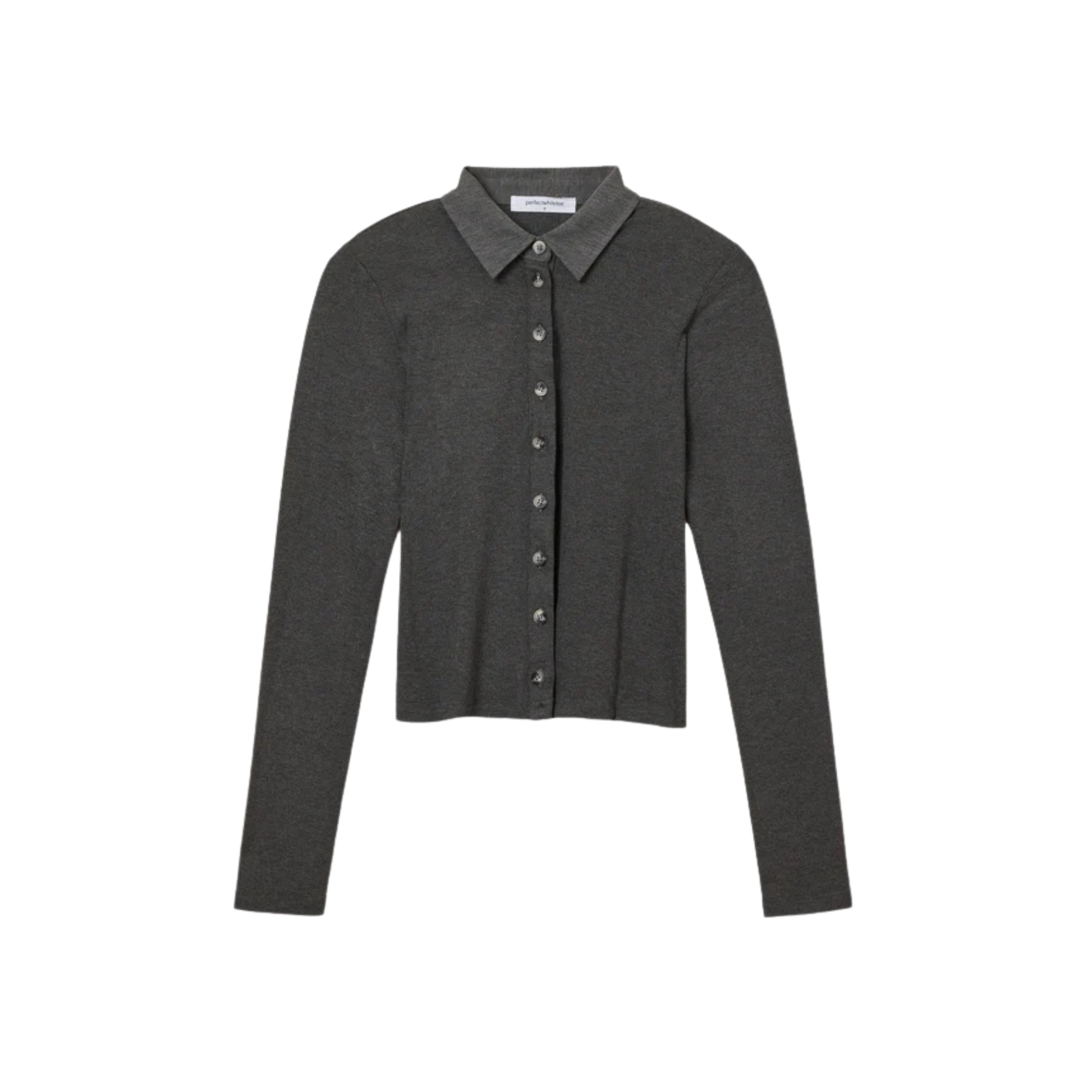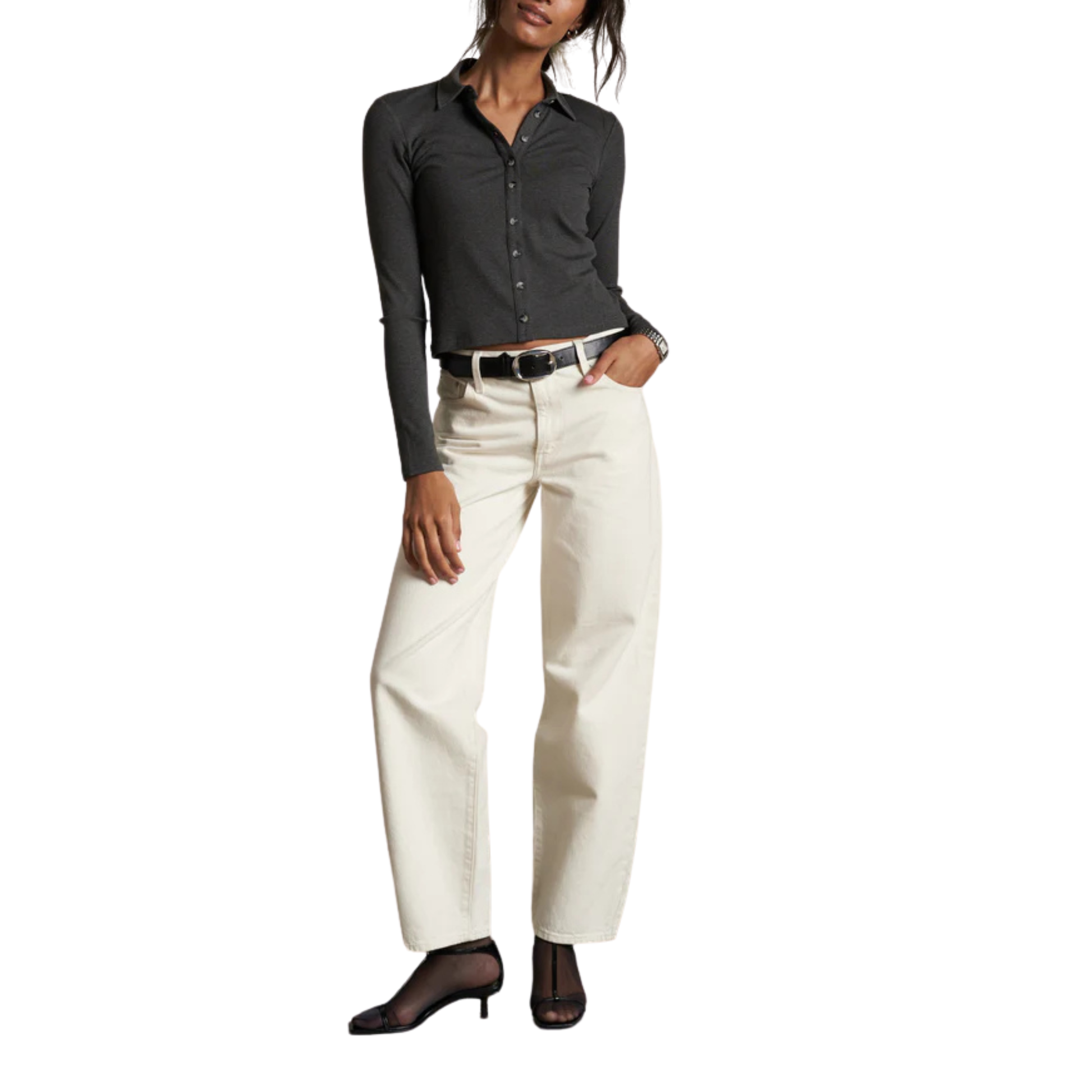 the amee top is a luxe rib essential with a polished twist. fitted through the body with a full button-down front and soft collar, this one sits right at your belly button for that just-right proportion. wear it open over a tank or buttoned all the way up, she’s made to style both ways.