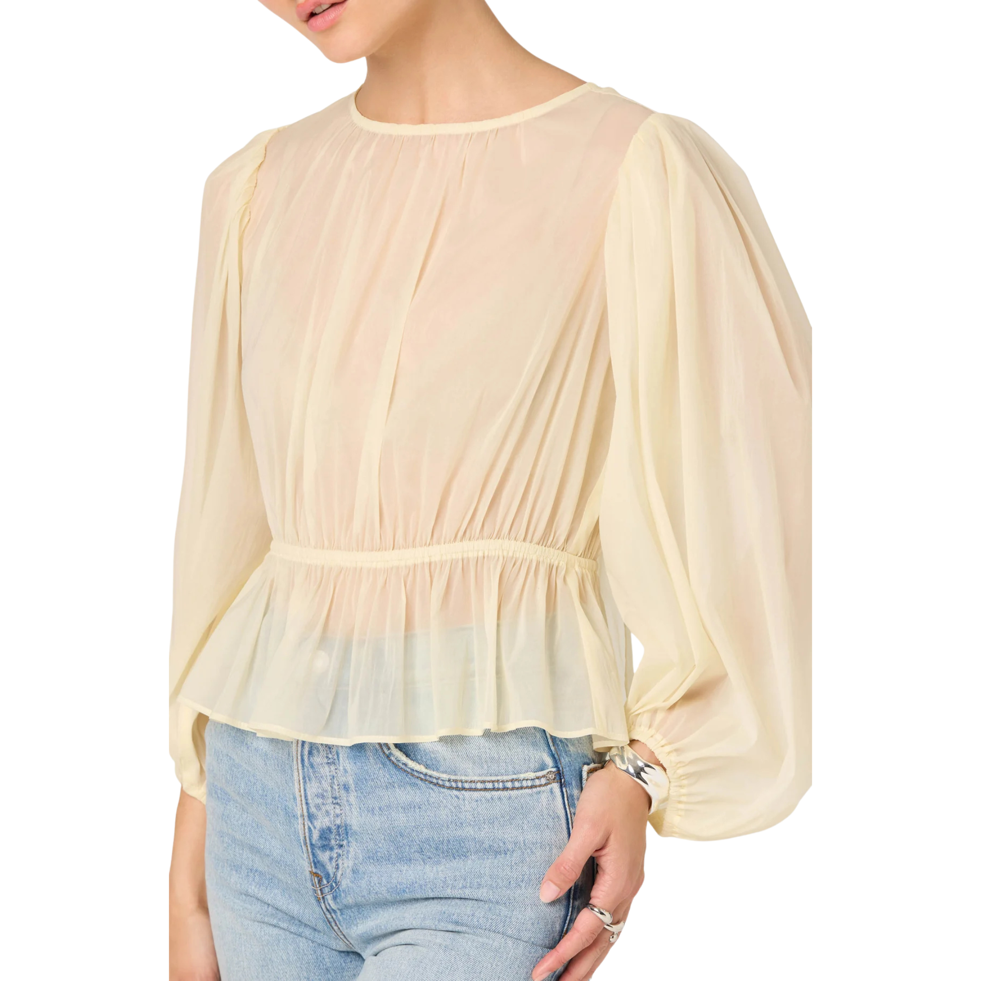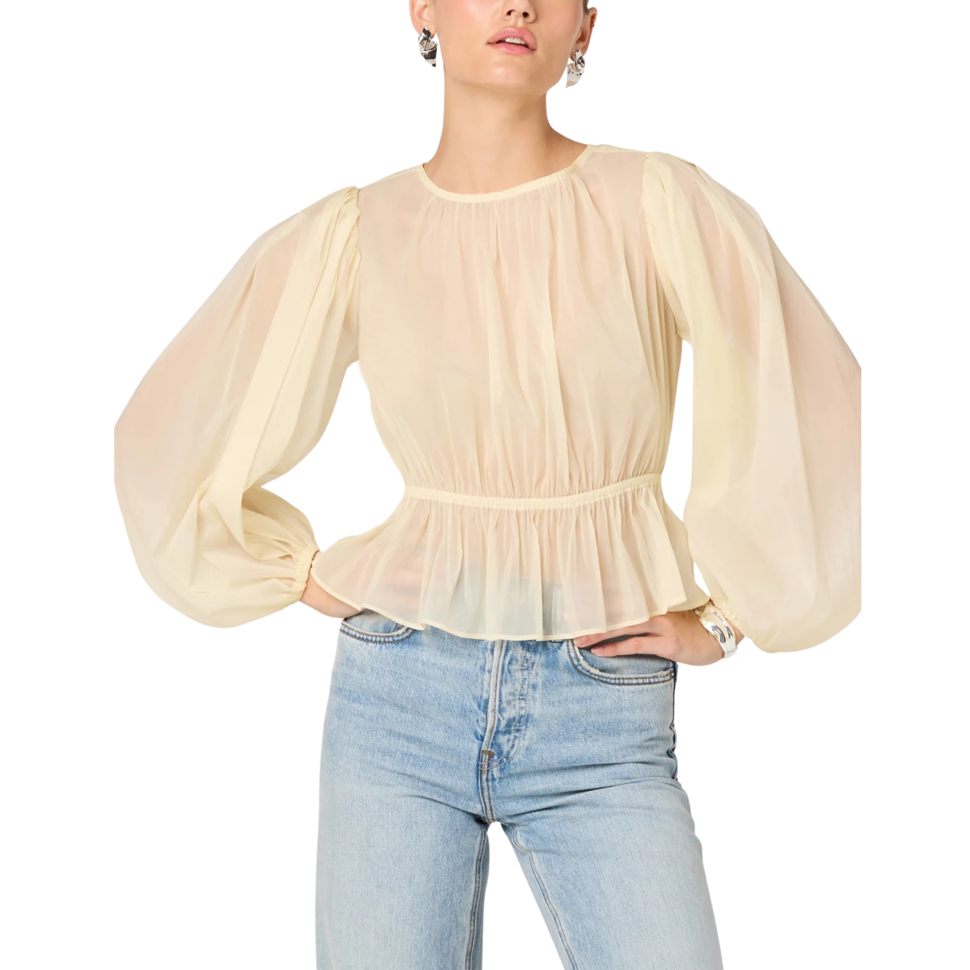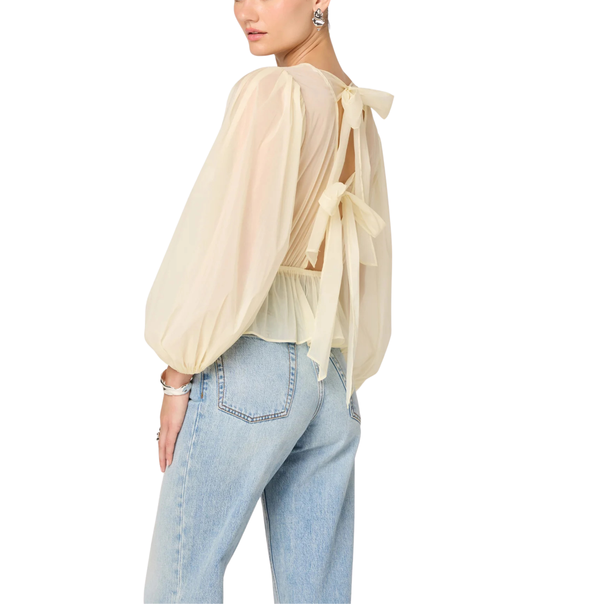 A sheer balloon sleeve top with an open back and self tie bow details. Chic and statement making, it pairs perfectly with jeans for an elevated night out look.
