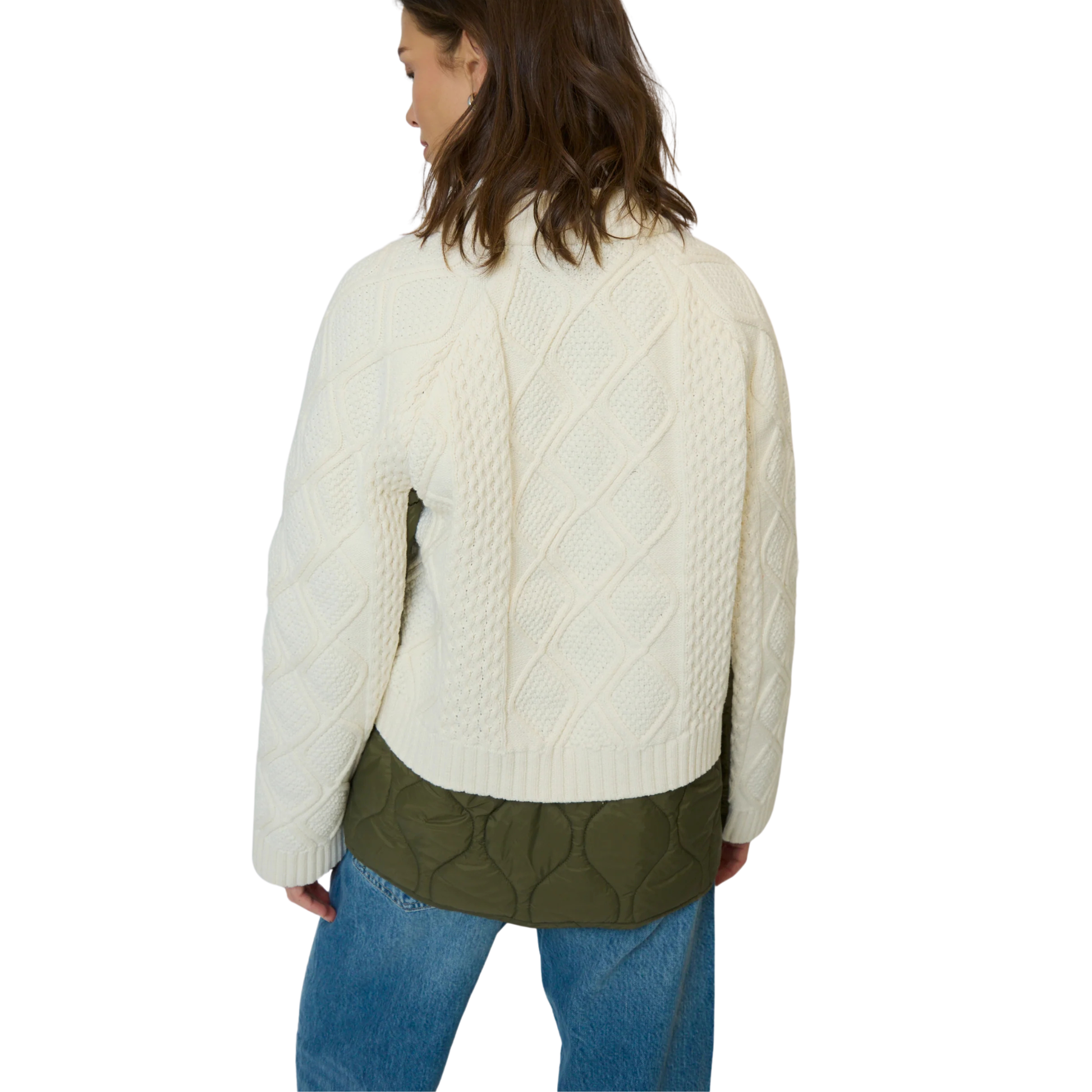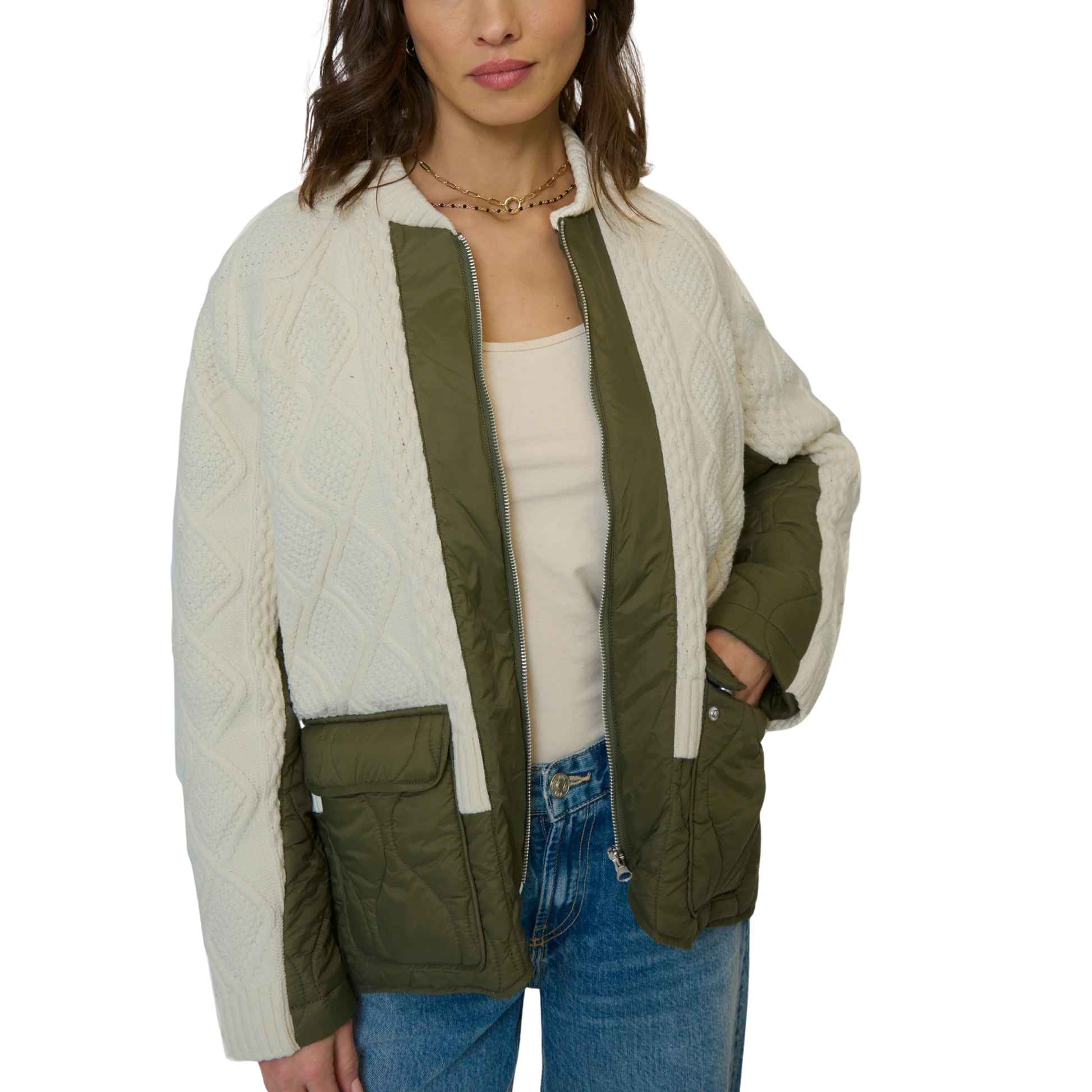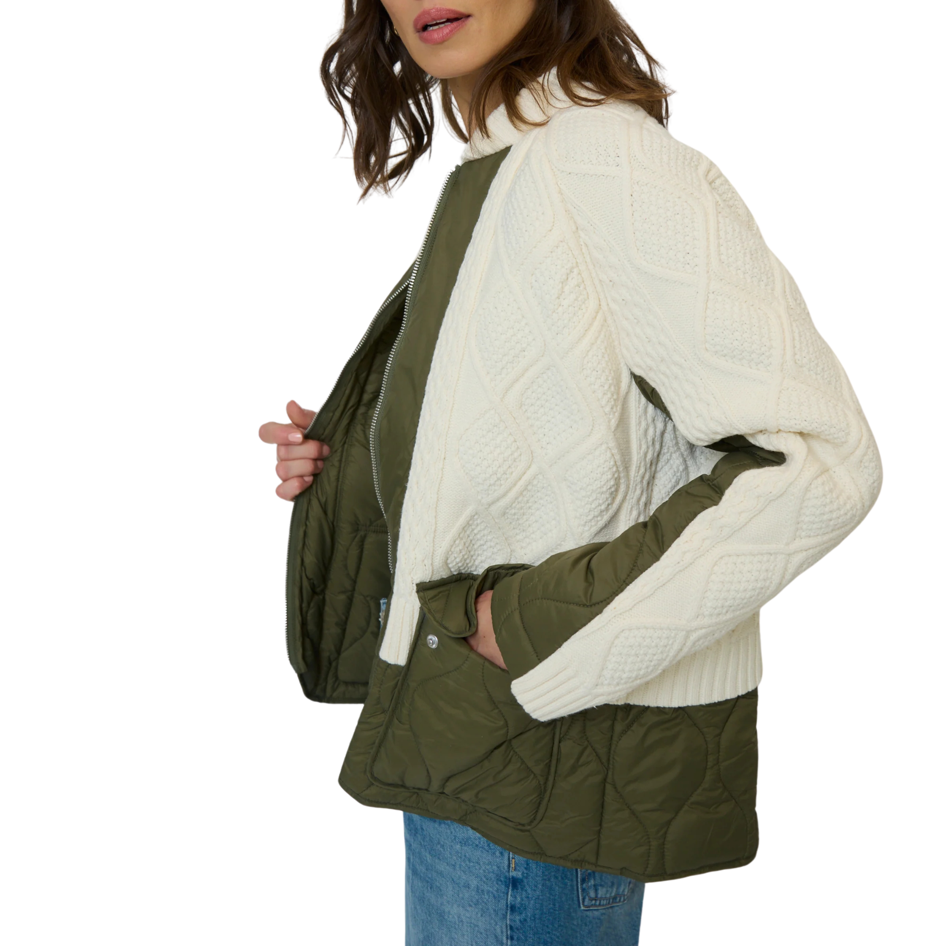 - Mixed media design with knit and quilted panels