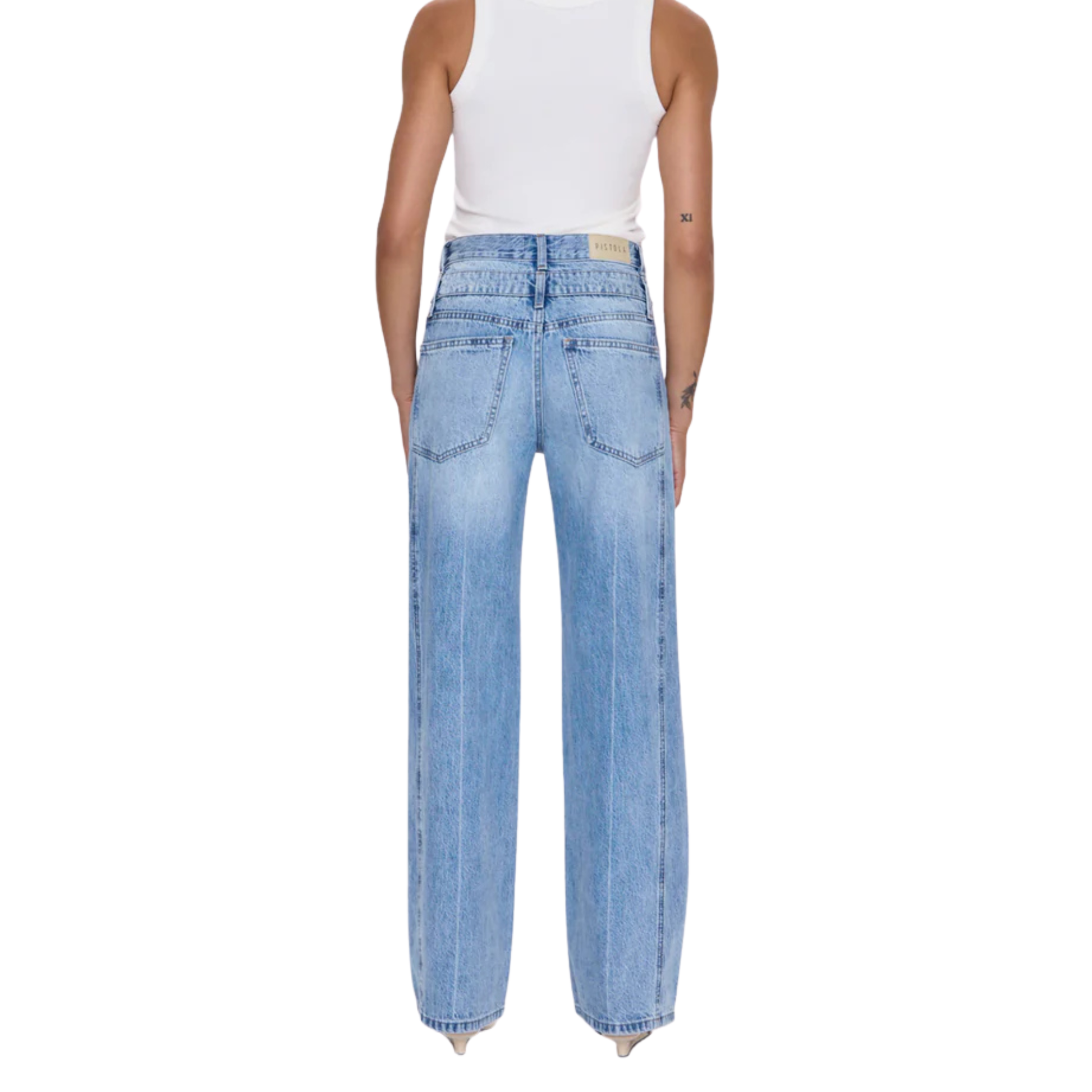 high rise denim with a relaxed, wide leg silhouette and full length hem
