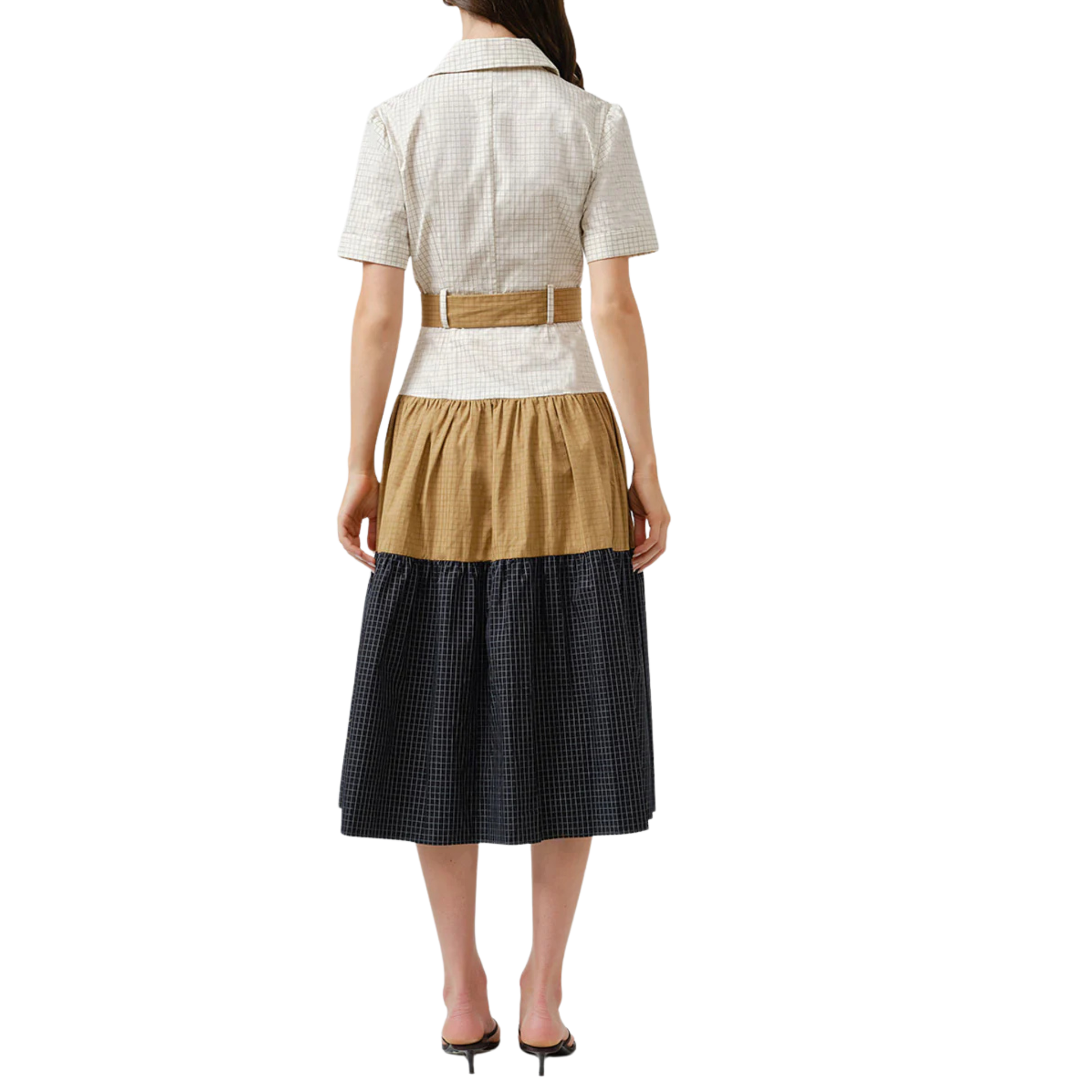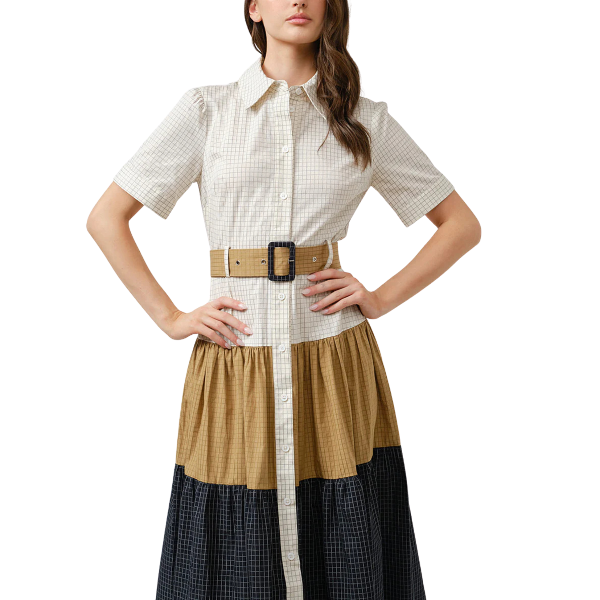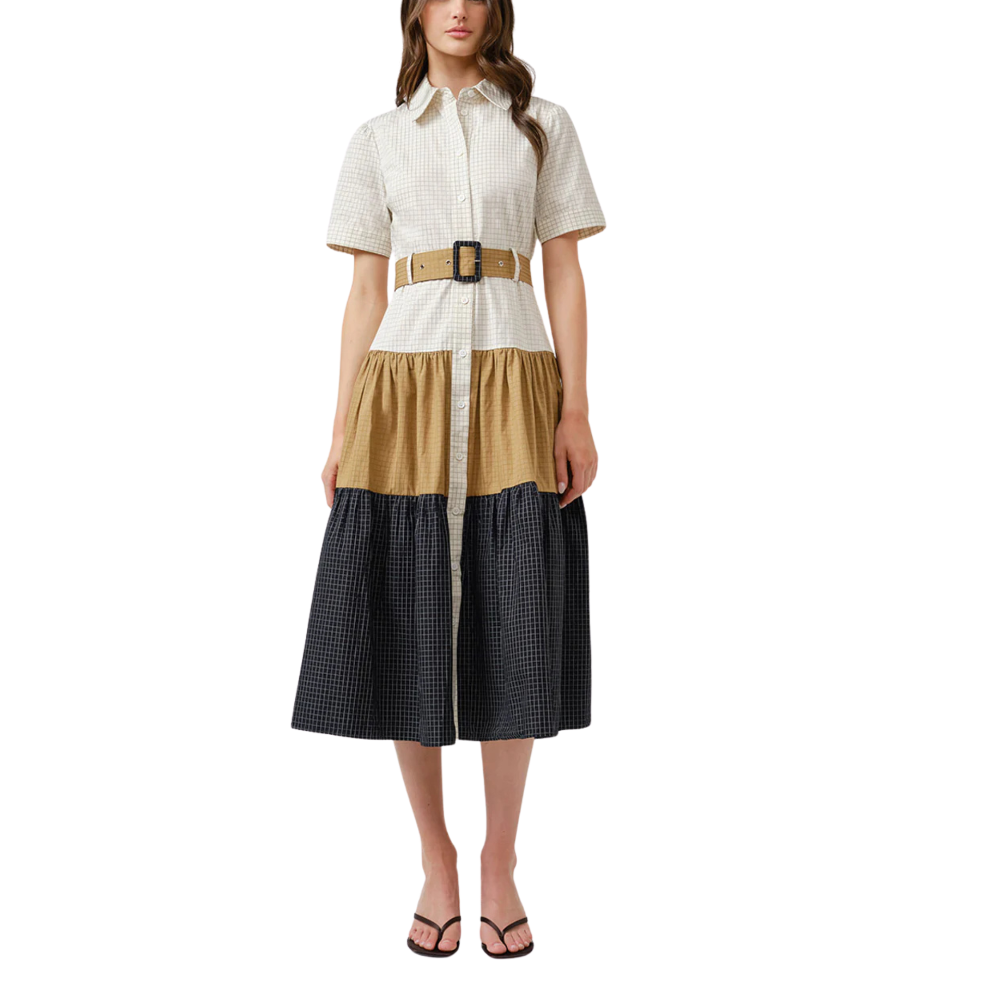 GRID COMBO TIERED BELTED SHIRT DRESS