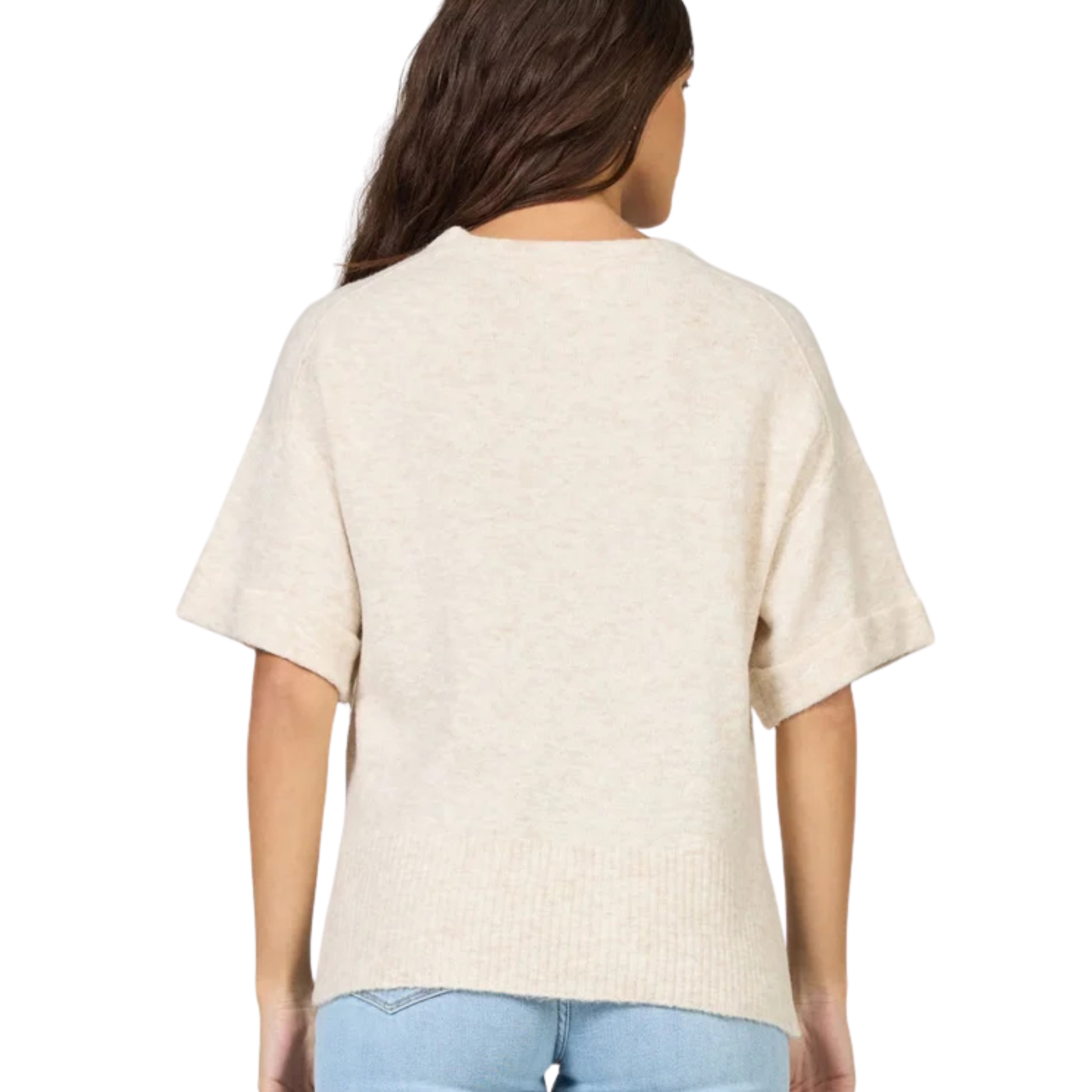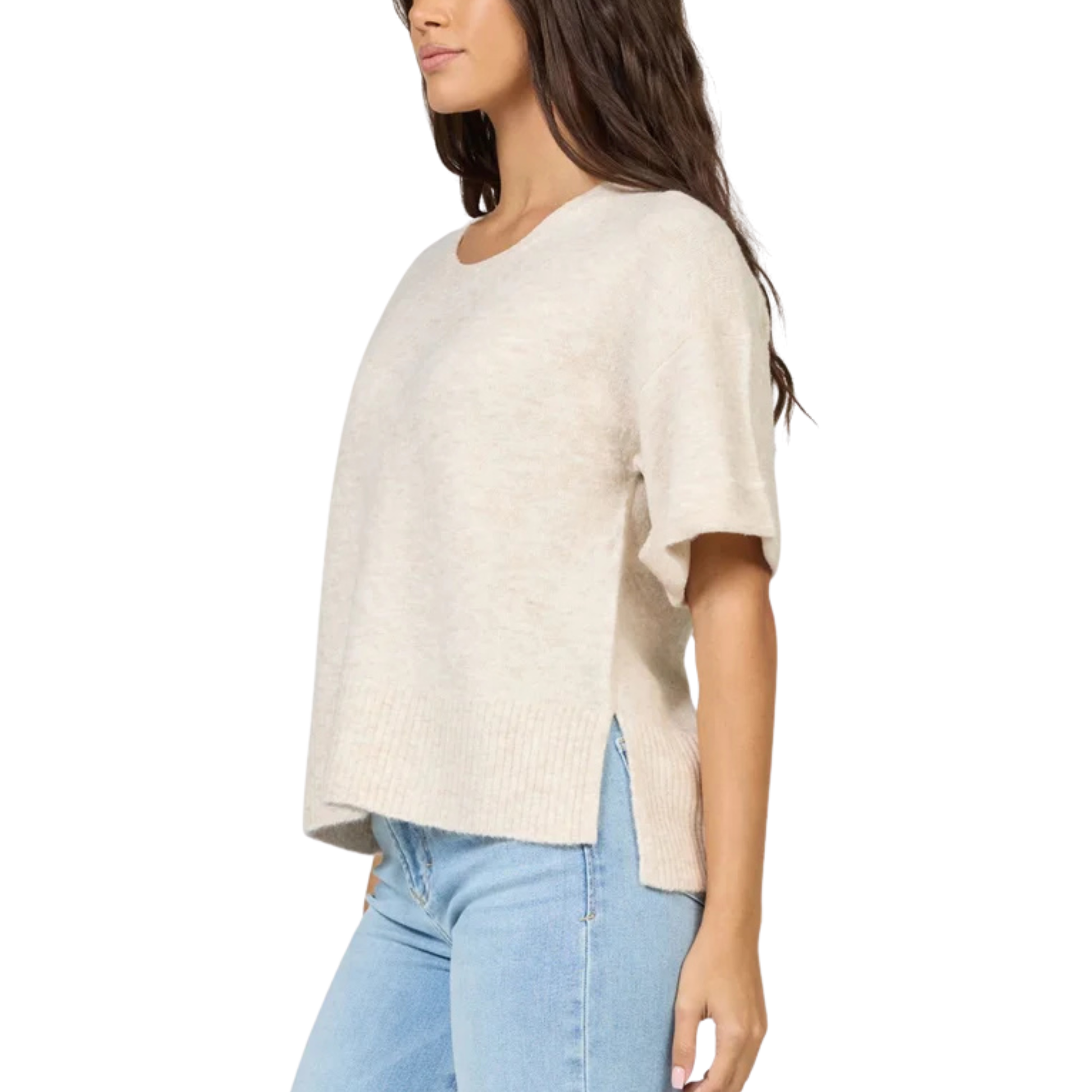Catrina crew neck short sleeve sweater with side slit, a versatile piece combines comfort and style, perfect for layering or wearing on its own.