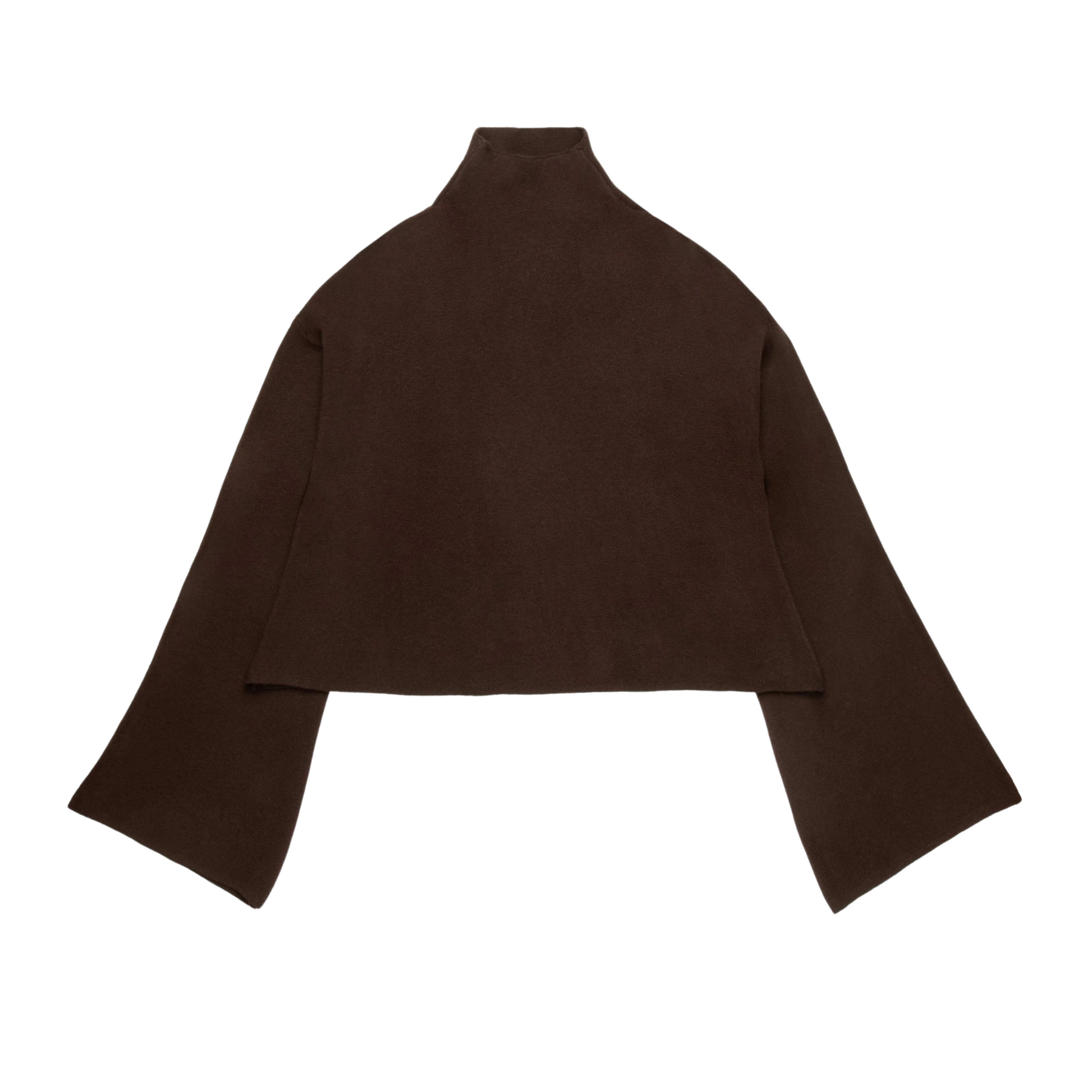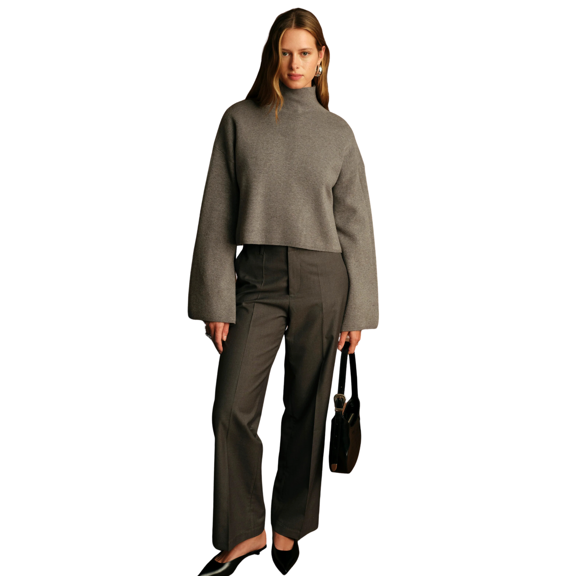 Viscose blend sweater with turtleneck and long wide sleeves. Crop length