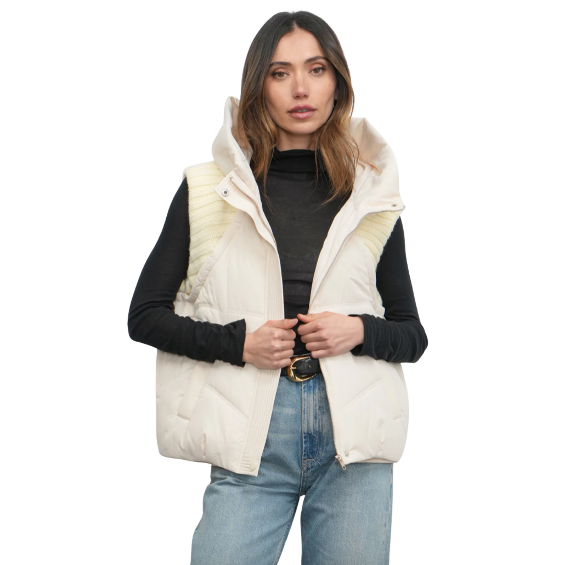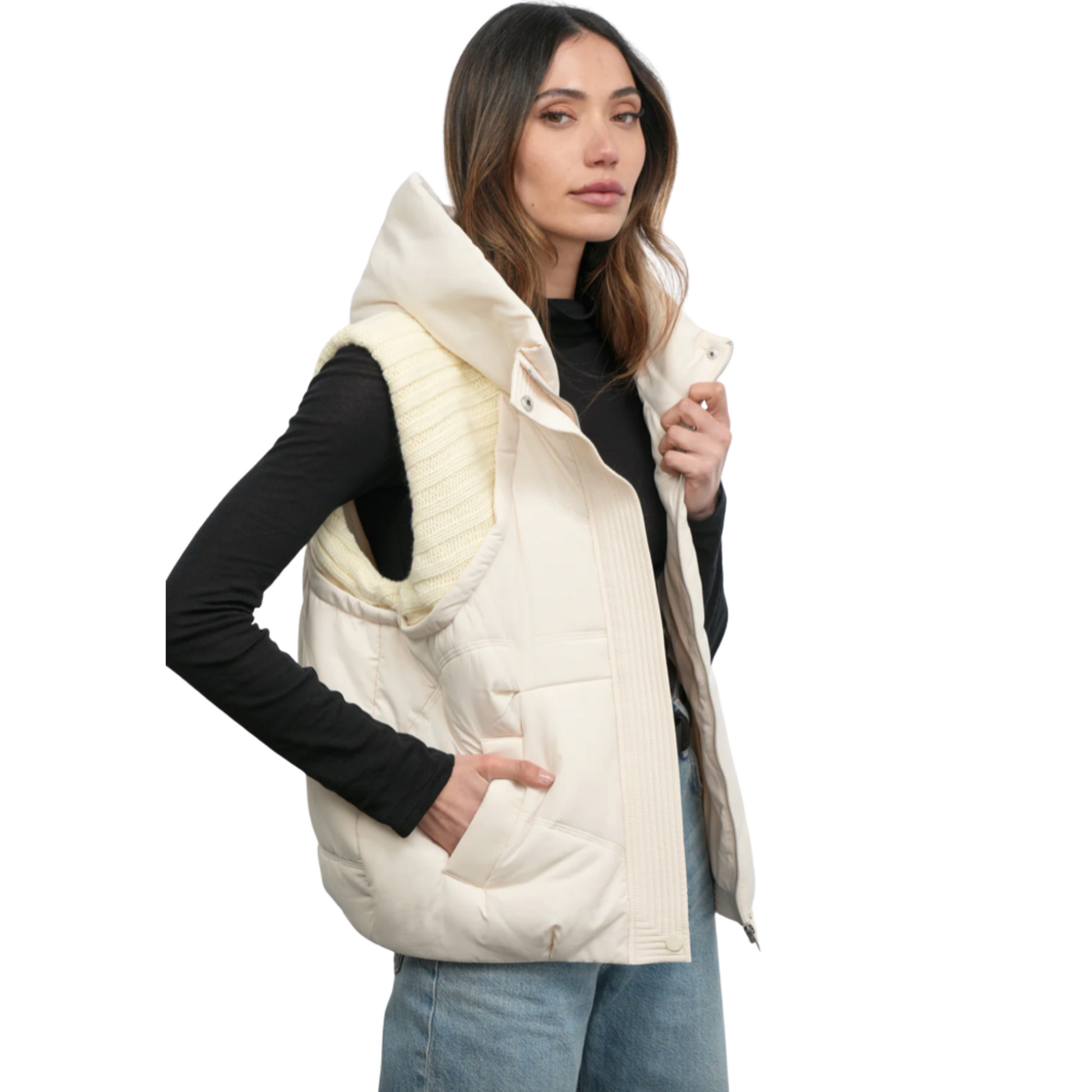 This versatile puffer vest, in a sophisticated neutral hue, offers a unique ribbed texture that adds depth and modern appeal to a classic design. It features a cozy hood for added warmth and a convenient zip-front closure, ensuring both comfort and ease of wear.