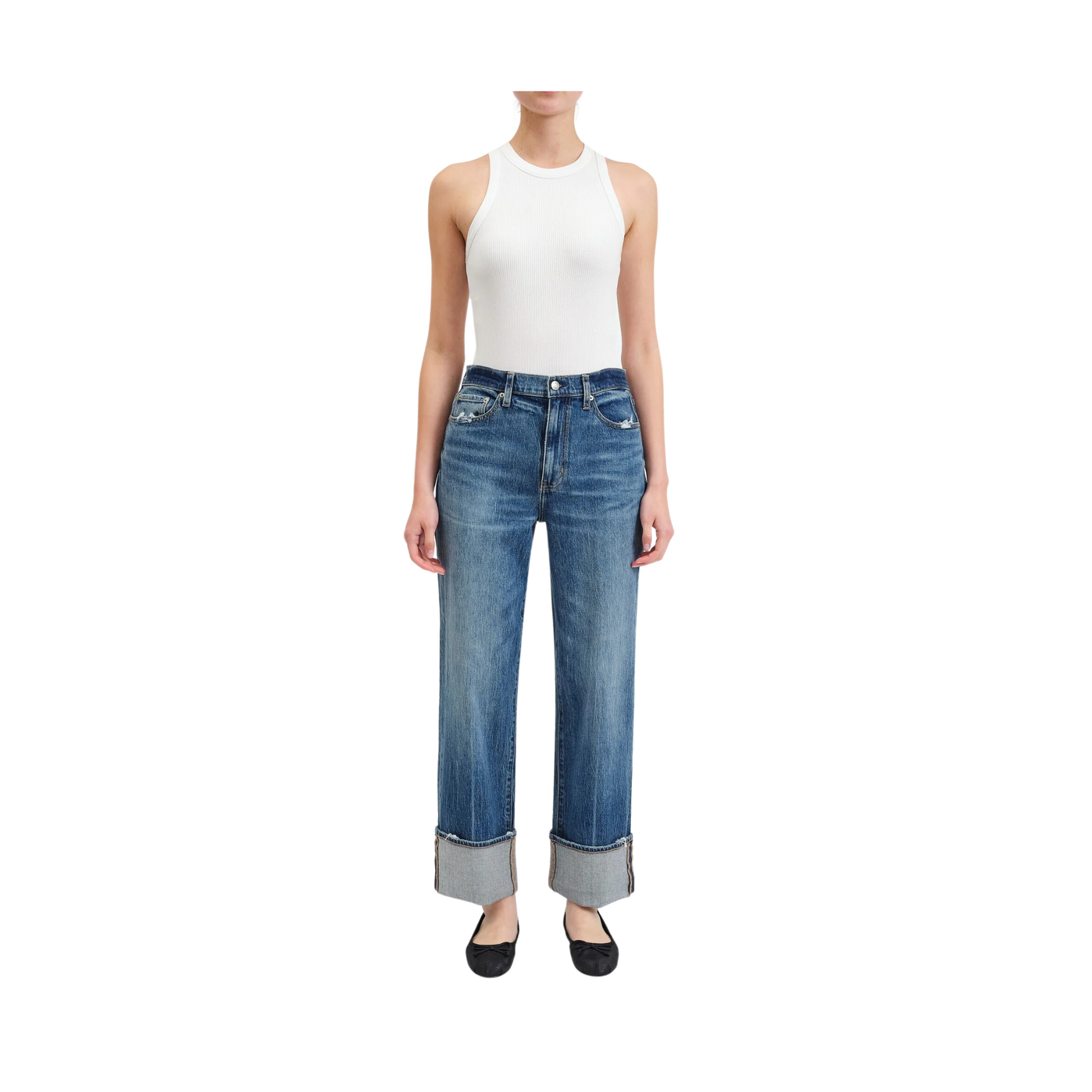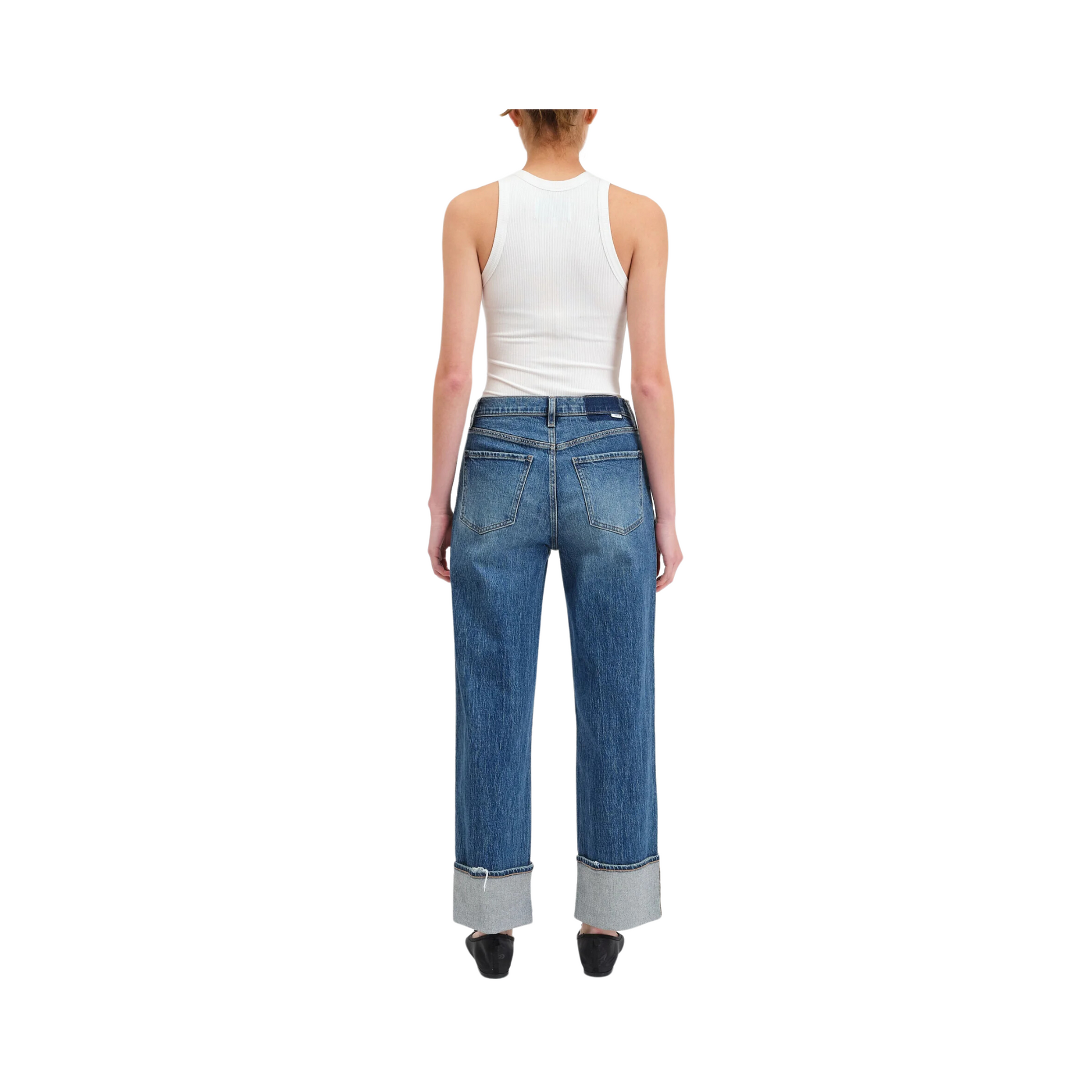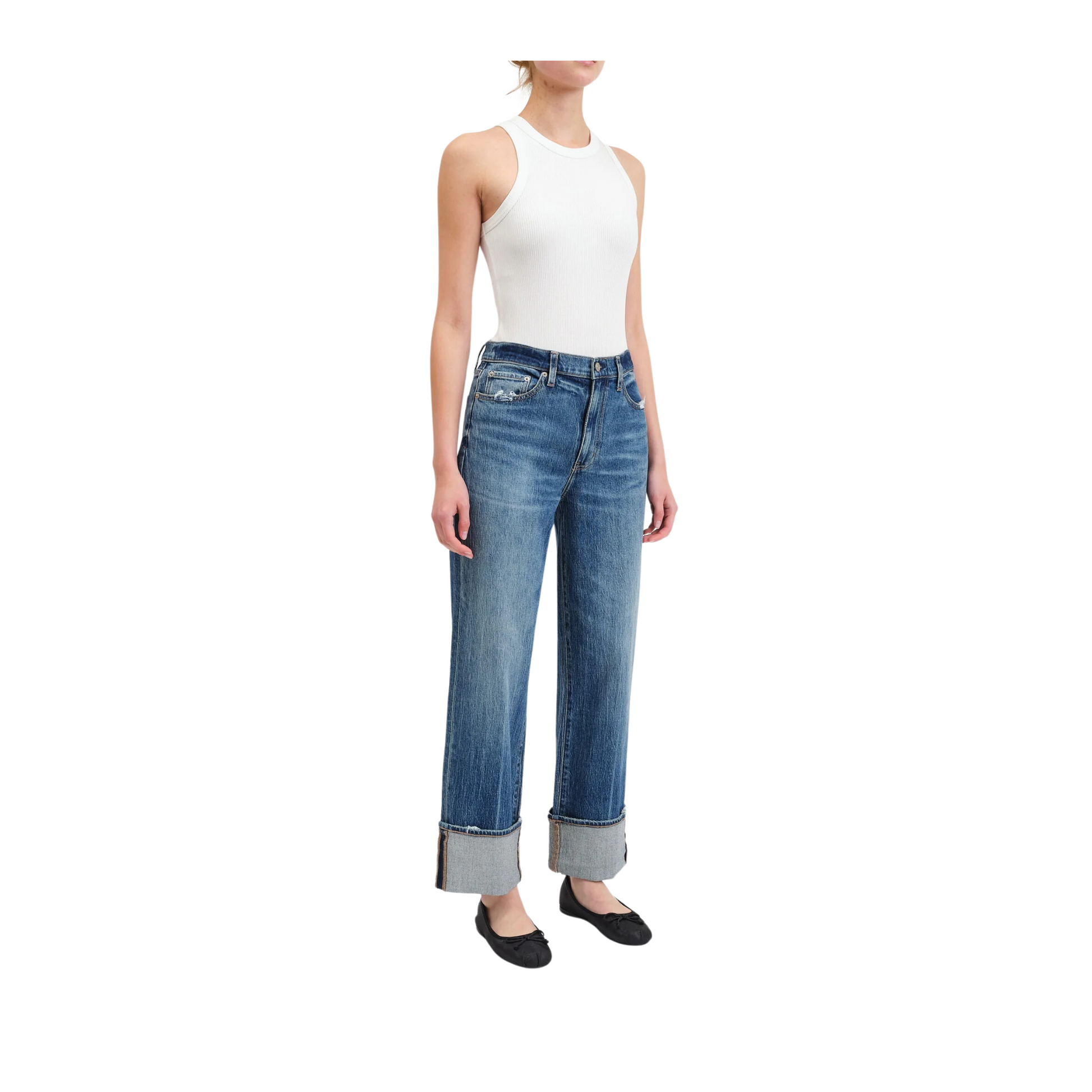 our relaxed fit cuffed denim is a straight that is constructed in a dark wash with slight fading throughout