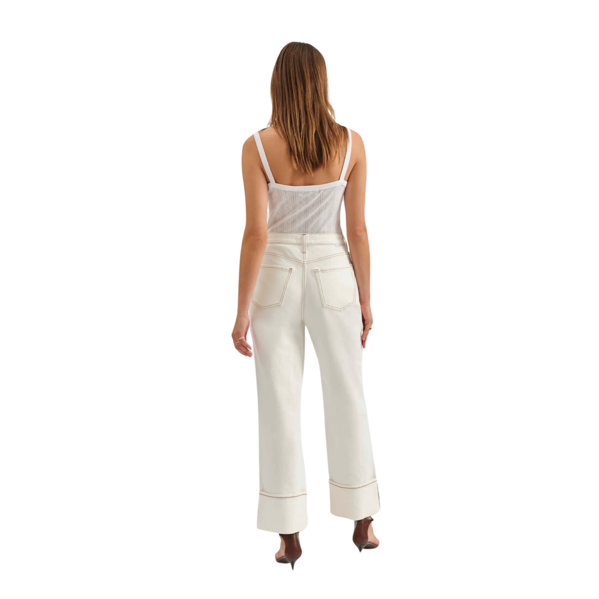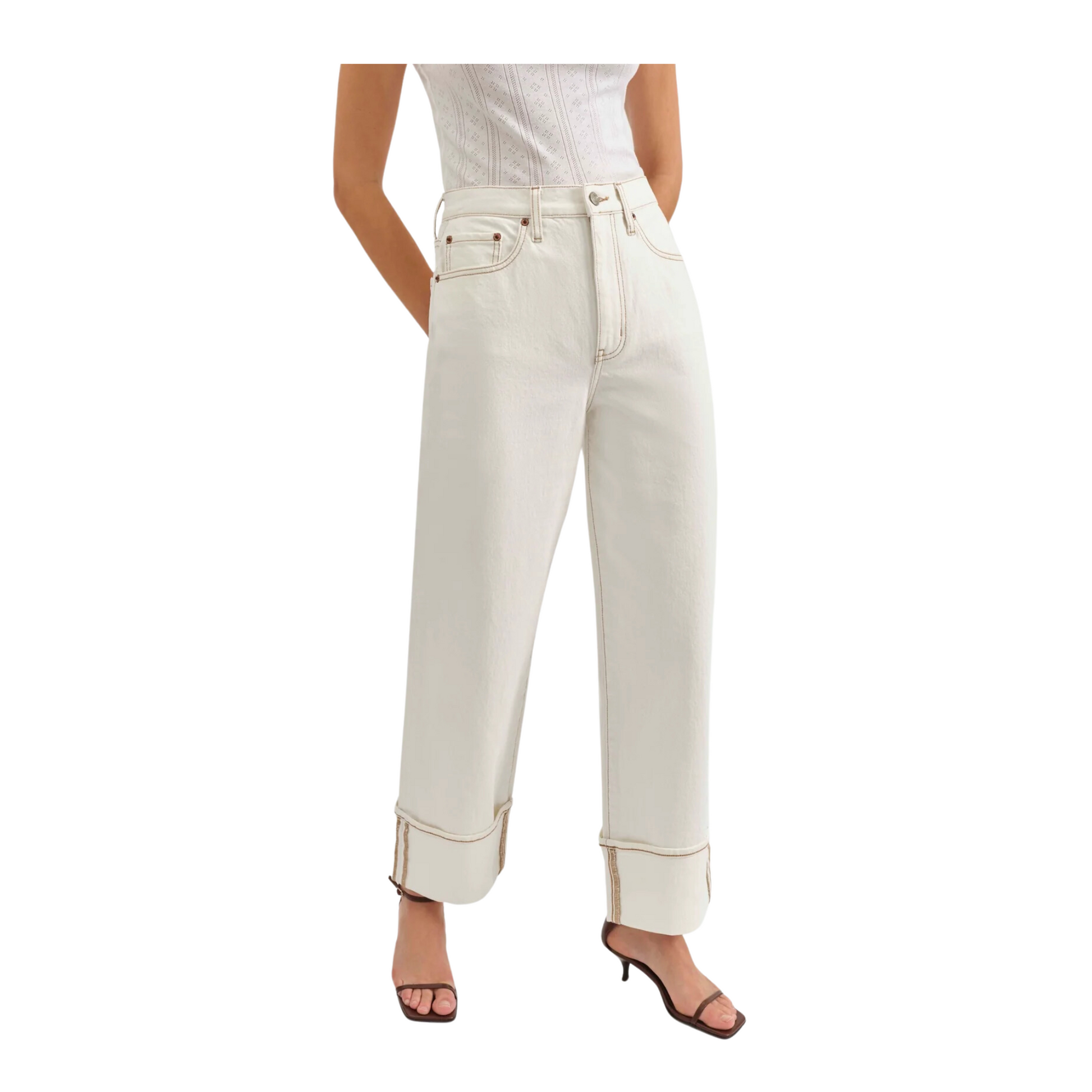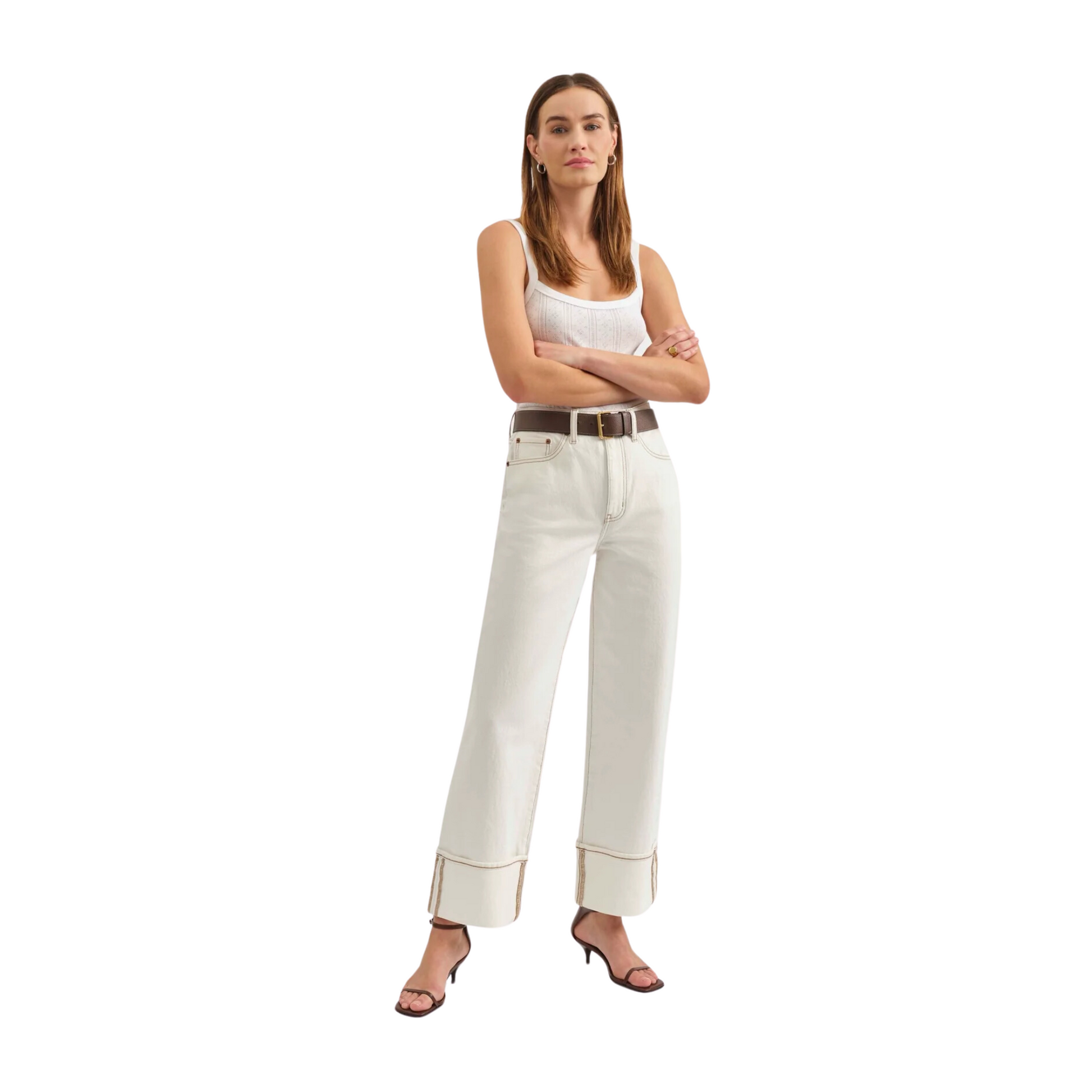 our relaxed fit cuffed denim is a straight that is constructed in a dark wash with slight fading throughout