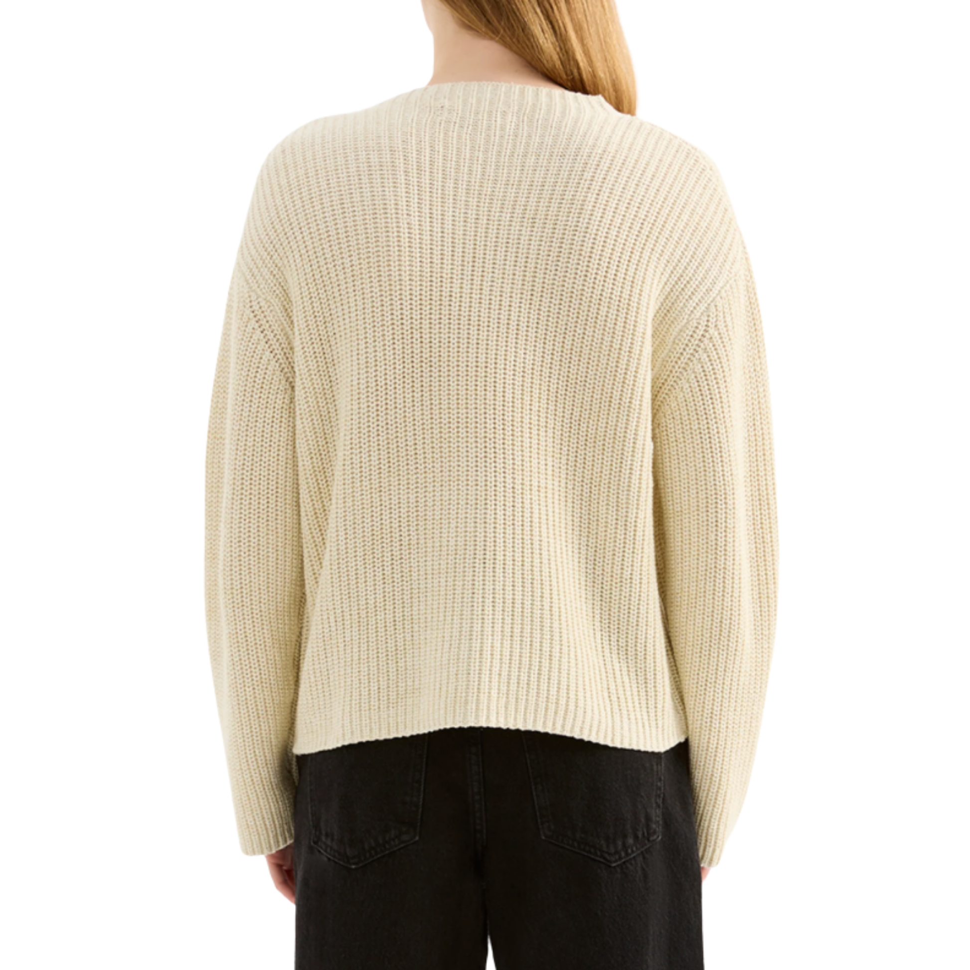 The Hana Knit is made from a midweight, cotton blend yarn with a soft and smooth hand feel. The silhouette is relaxed with a high neck and length finishing at the hips. Features include two-tone yarn and rib knit construction.