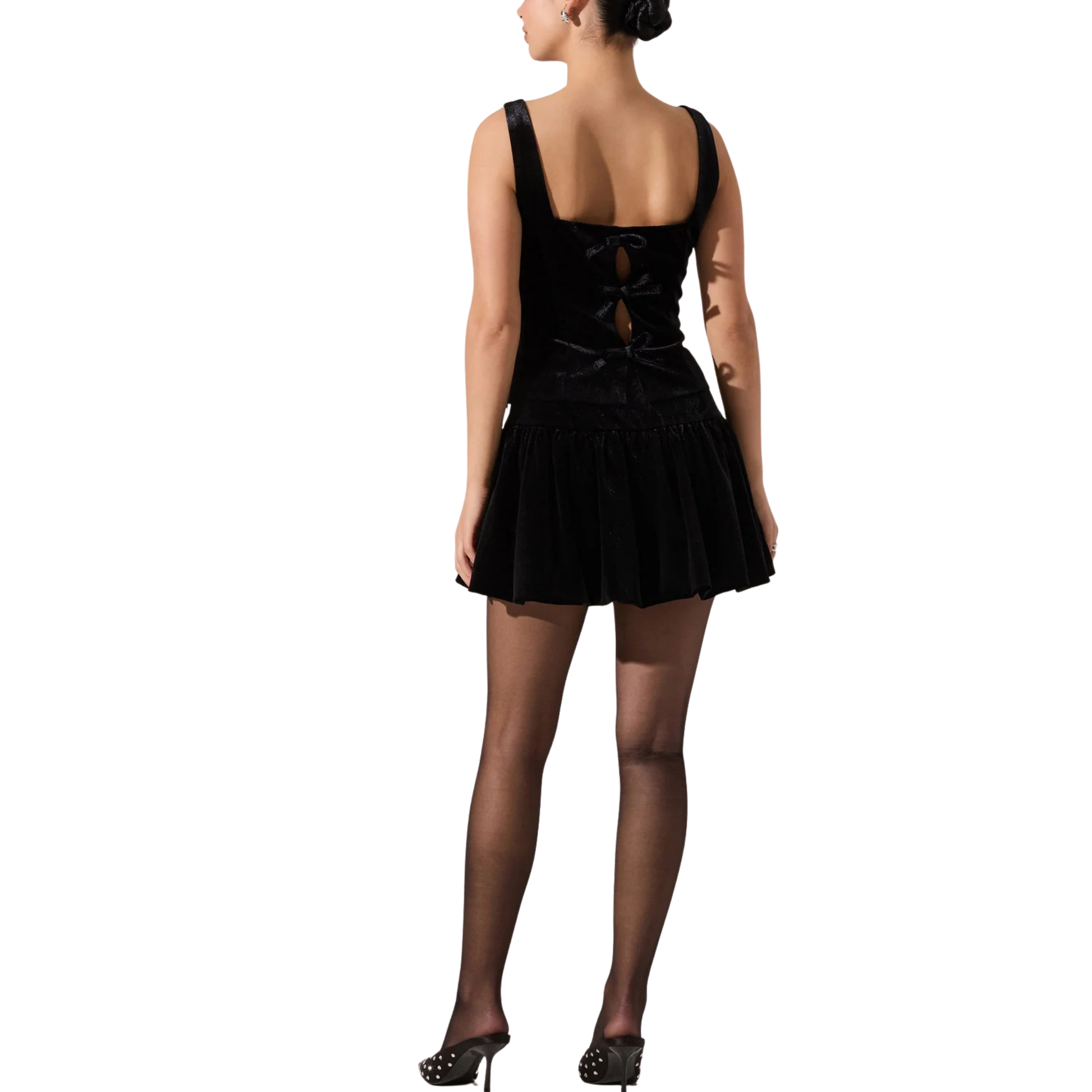 Crafted with a rich velvet, this bow back top features a boat neckline and keyhole cutouts for a romantic silhouette. Perfect for styling with denim or dressing up for date night with its matching skirt.