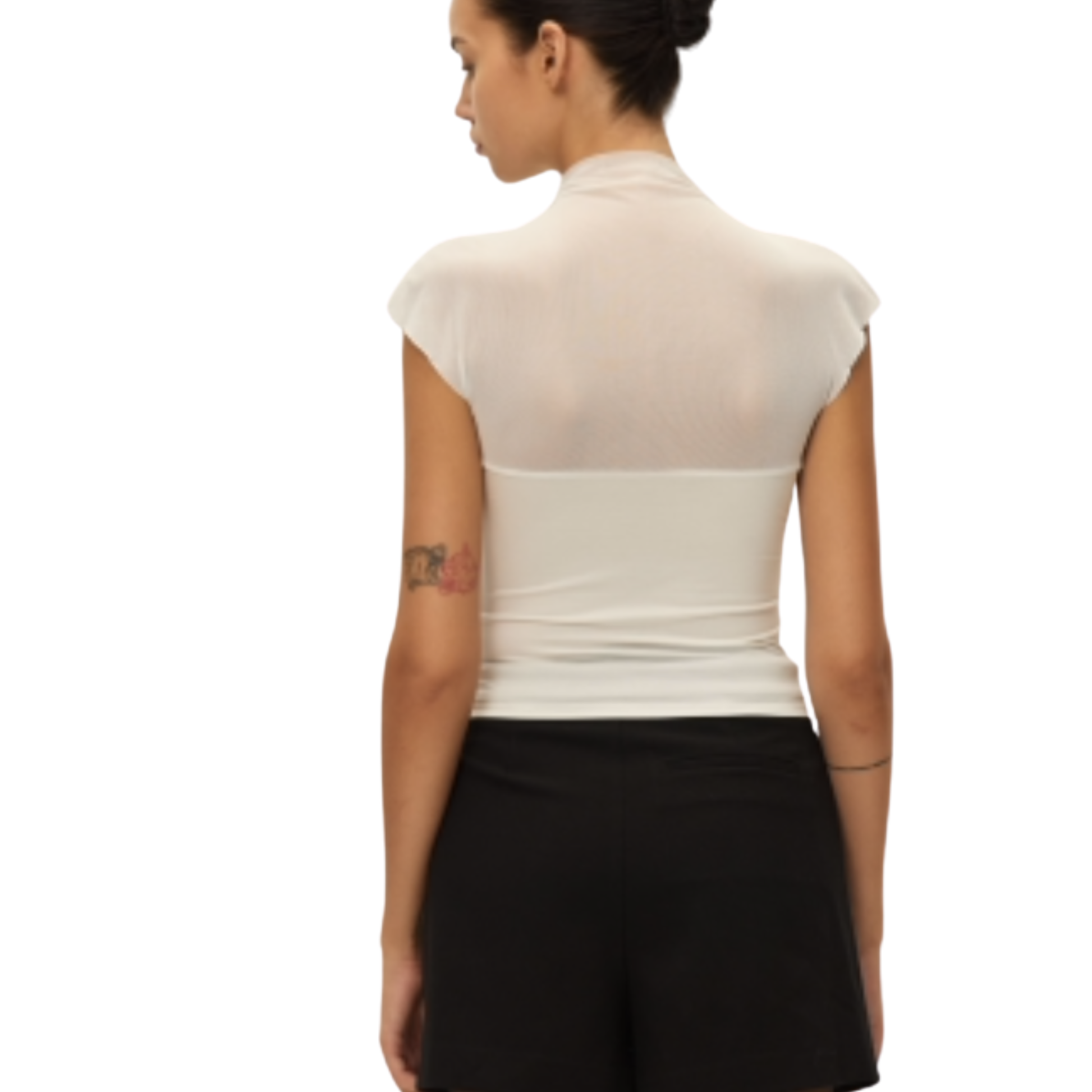 Sheer mesh mock neck top.