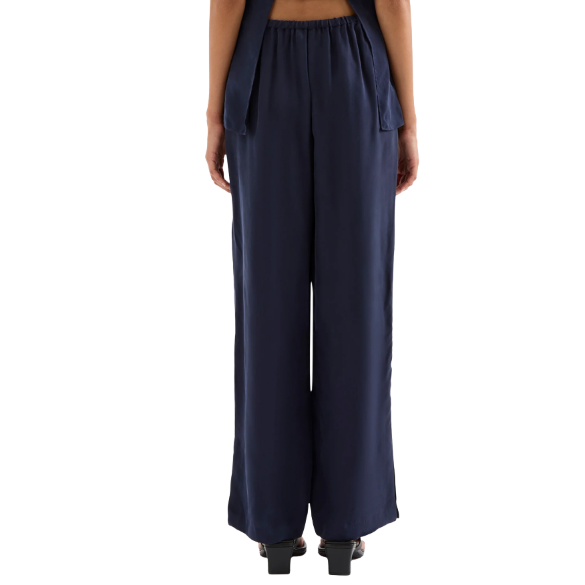 The Linnea Cupro Pant is made in our signature cupro fabrication which has a soft, sueded hand feel. The silhouette is a relaxed wide leg, full length pant. Features include an elasticated waistband, side seam pockets and slits at hem.