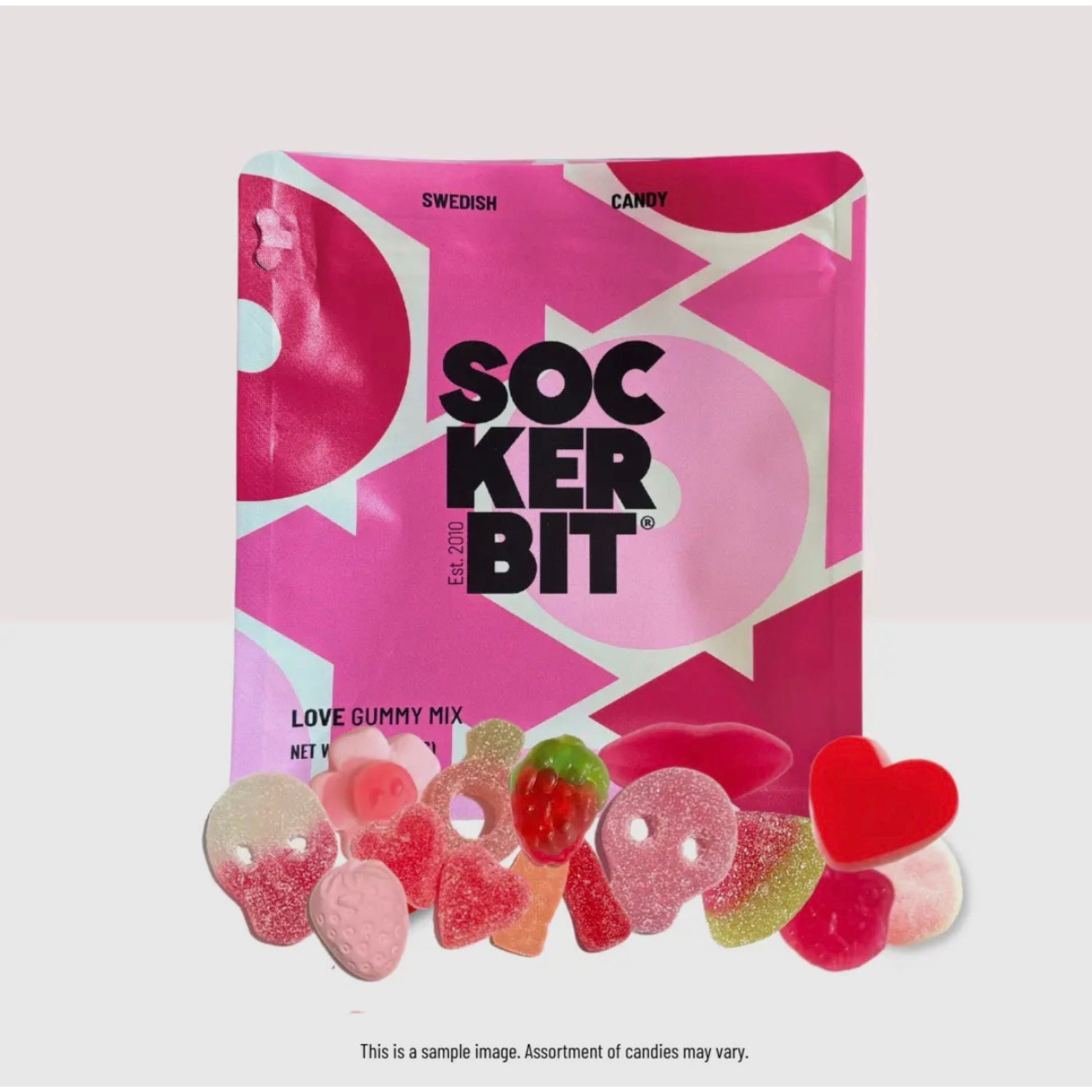 Spread the love with our Valentine's Love Gummy Mix Swedish Candy Bag! This resealable pouch bag is filled with a variety of sweet and sour gummies, perfectly themed for the holiday of love. Ideal for gifting or indulging, this candy pouch bag is the perfect treat for Valentine's Day. (Hint: It's also great for a candy drawer, work bag, or movie date!) Imported from Scandinavia, made with quality, non-GMO ingredients, and free from high fructose corn syrup, red 40, and trans fats. Freshly packed with love and care at Sockerbit Los Angeles. Mix may vary per bag.