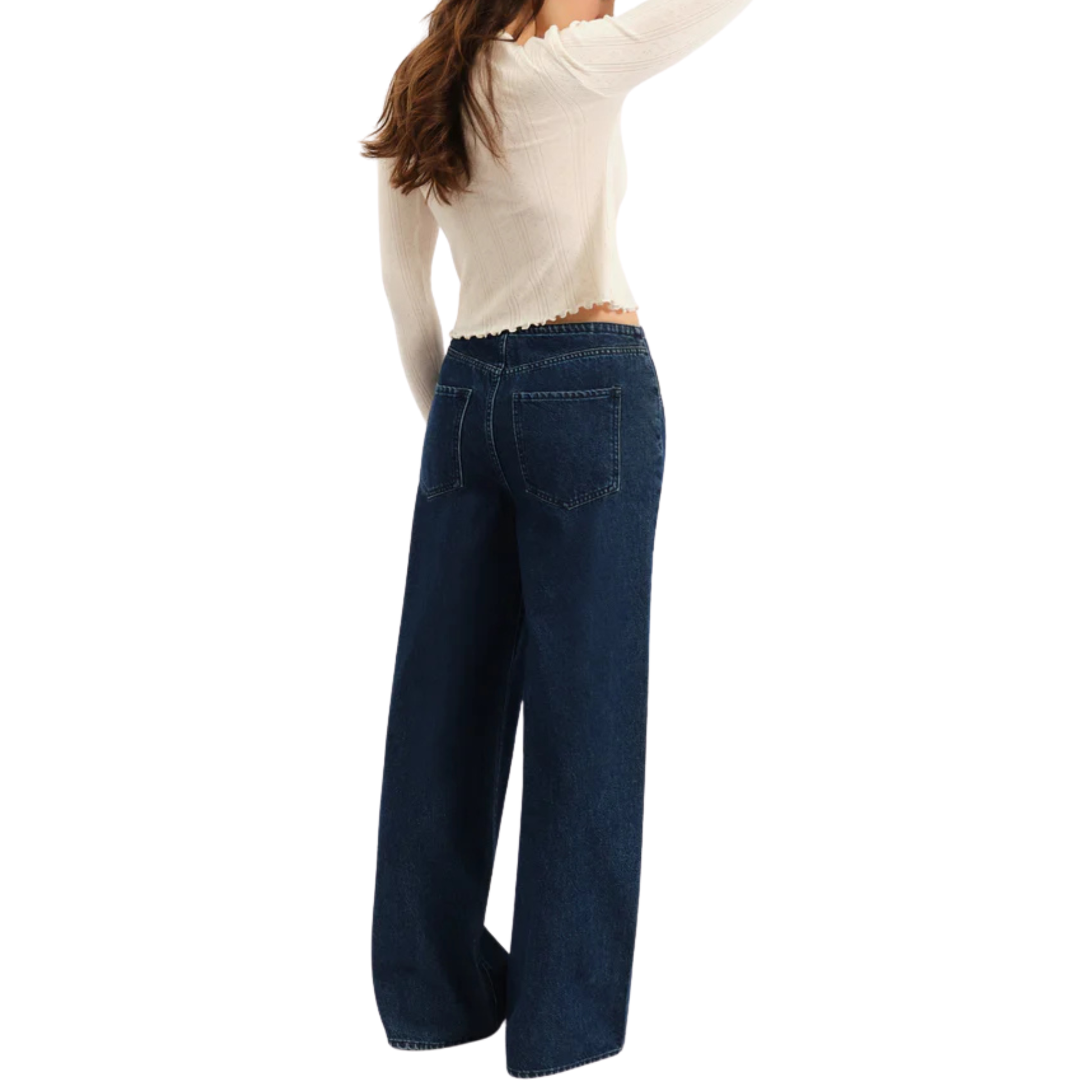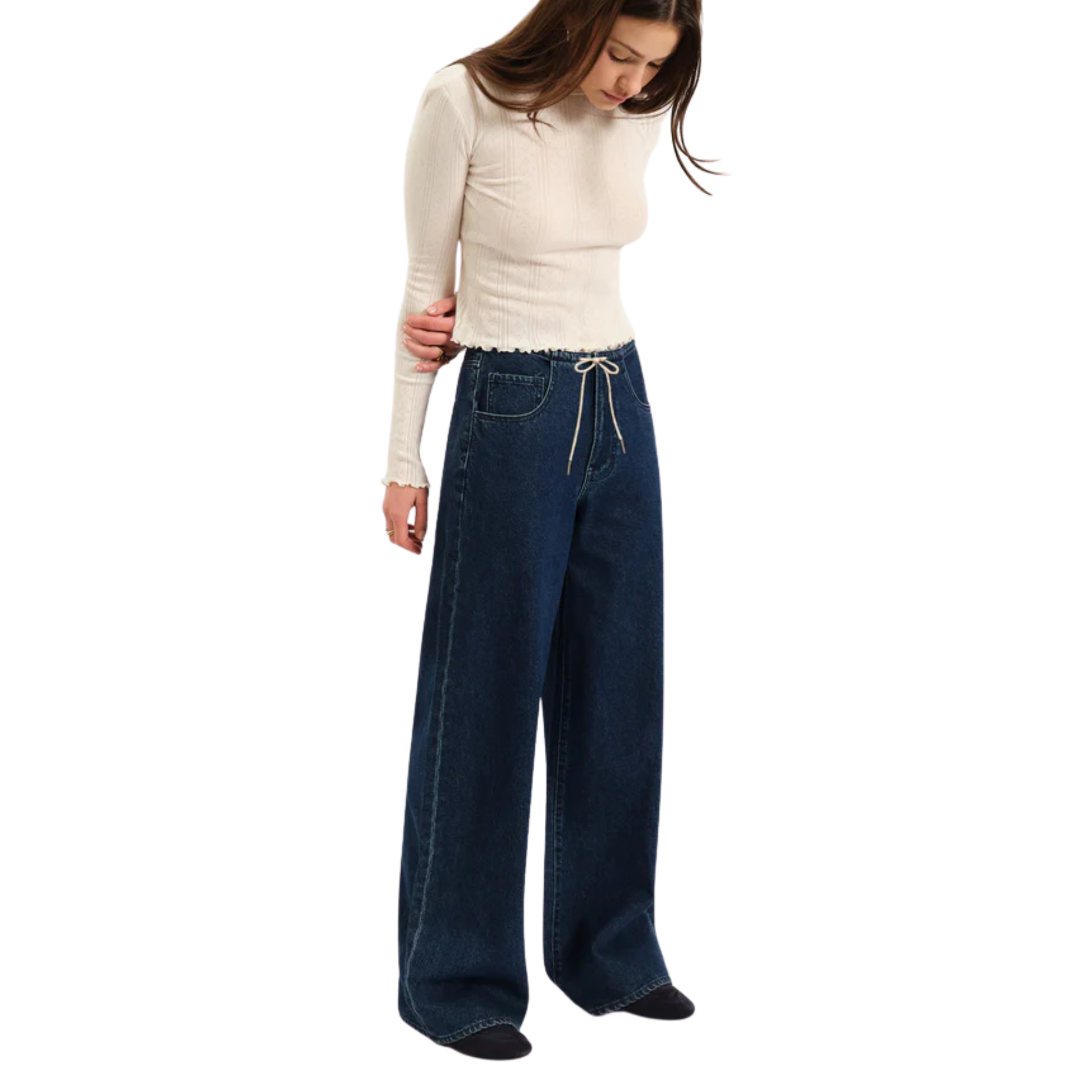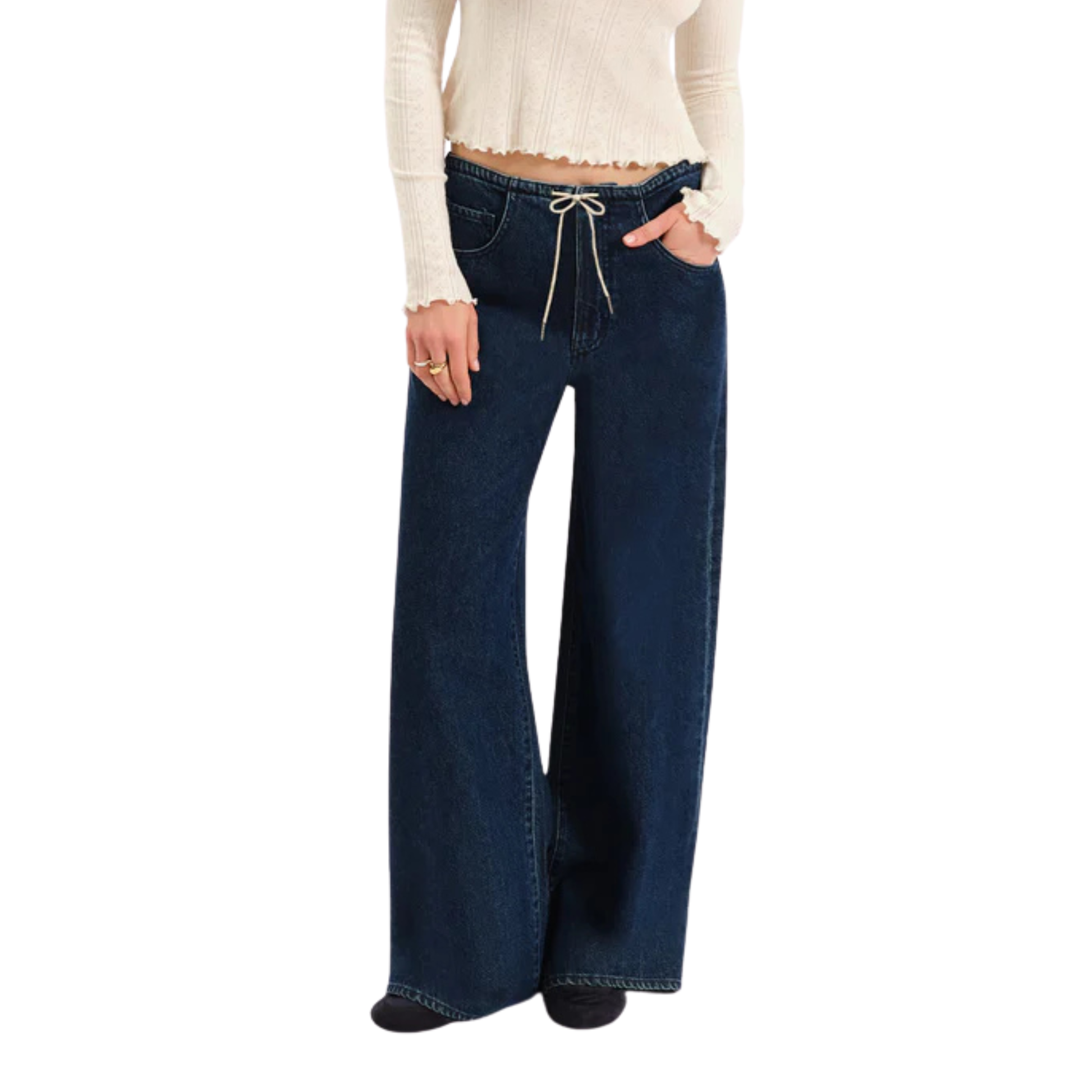 The Madison in Moonlight Rinse is a mid rise wide leg jean in a timeless dark wash. This laid-back jean features a drawstring waist for a custom fit.