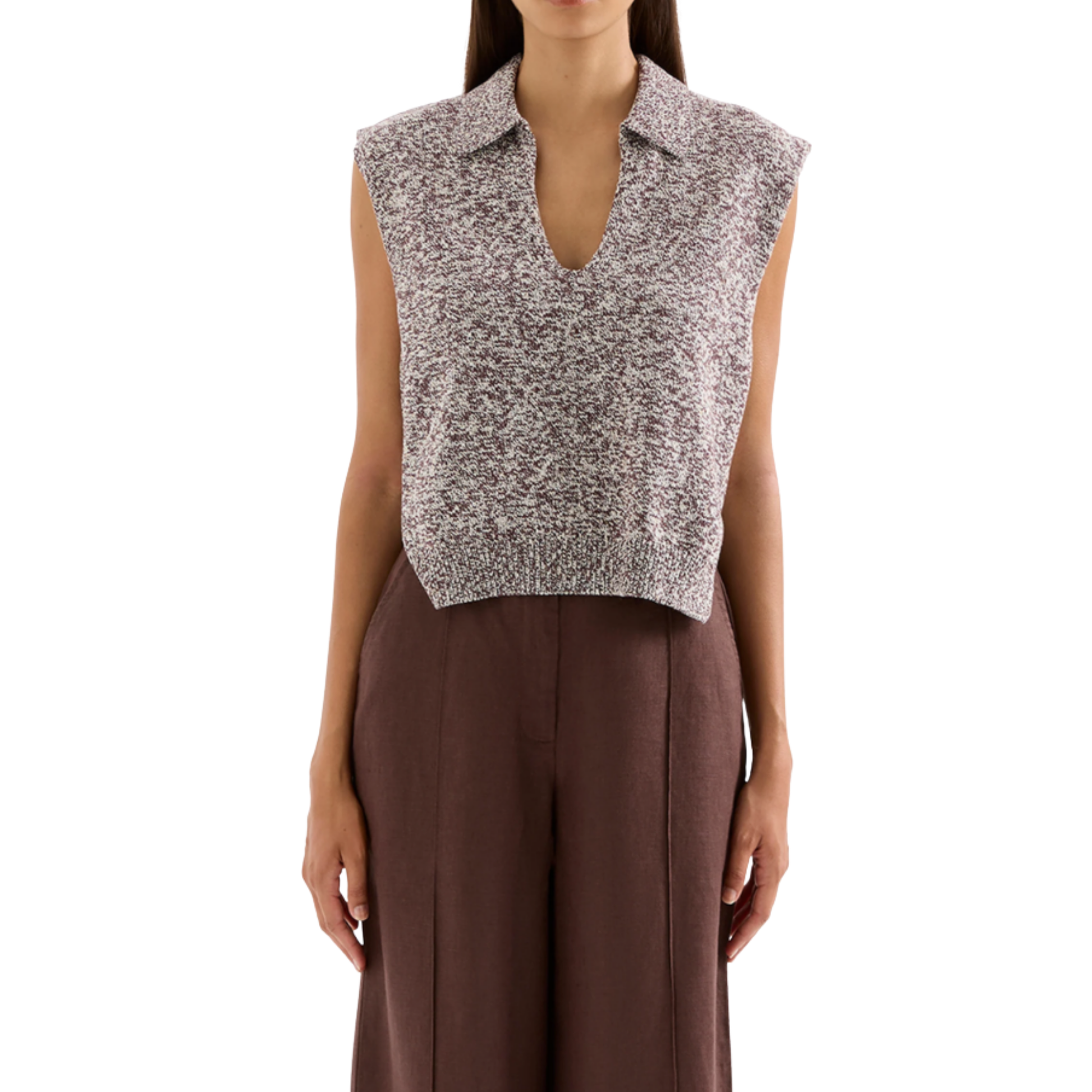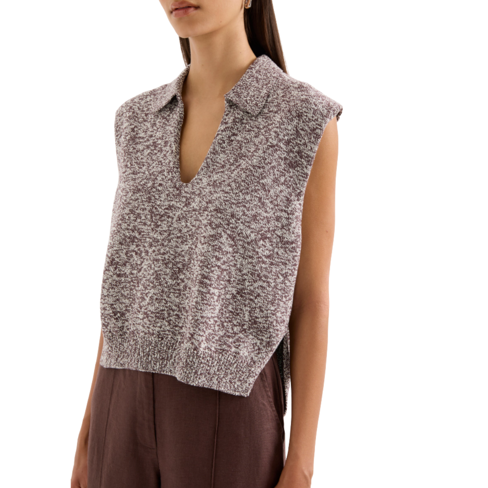 The Mio Knit Vest is crafted from 100% cotton yarn in a soft, smooth fabrication. The silhoutette is a relaxed, boxy fit for a comfortable feel. Features include fully knitted rugby collar and stepped hem with side slits.
