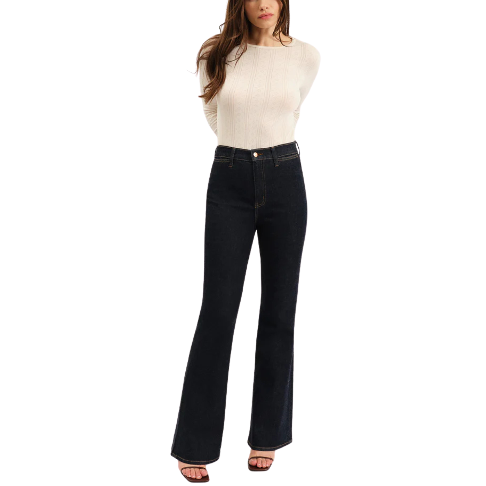 The Sunset Flare in Rinse is a high rise flared jean in a rich dark wash. This flattering fit hugs you at the waist and flares dramatically from knee to ankle.