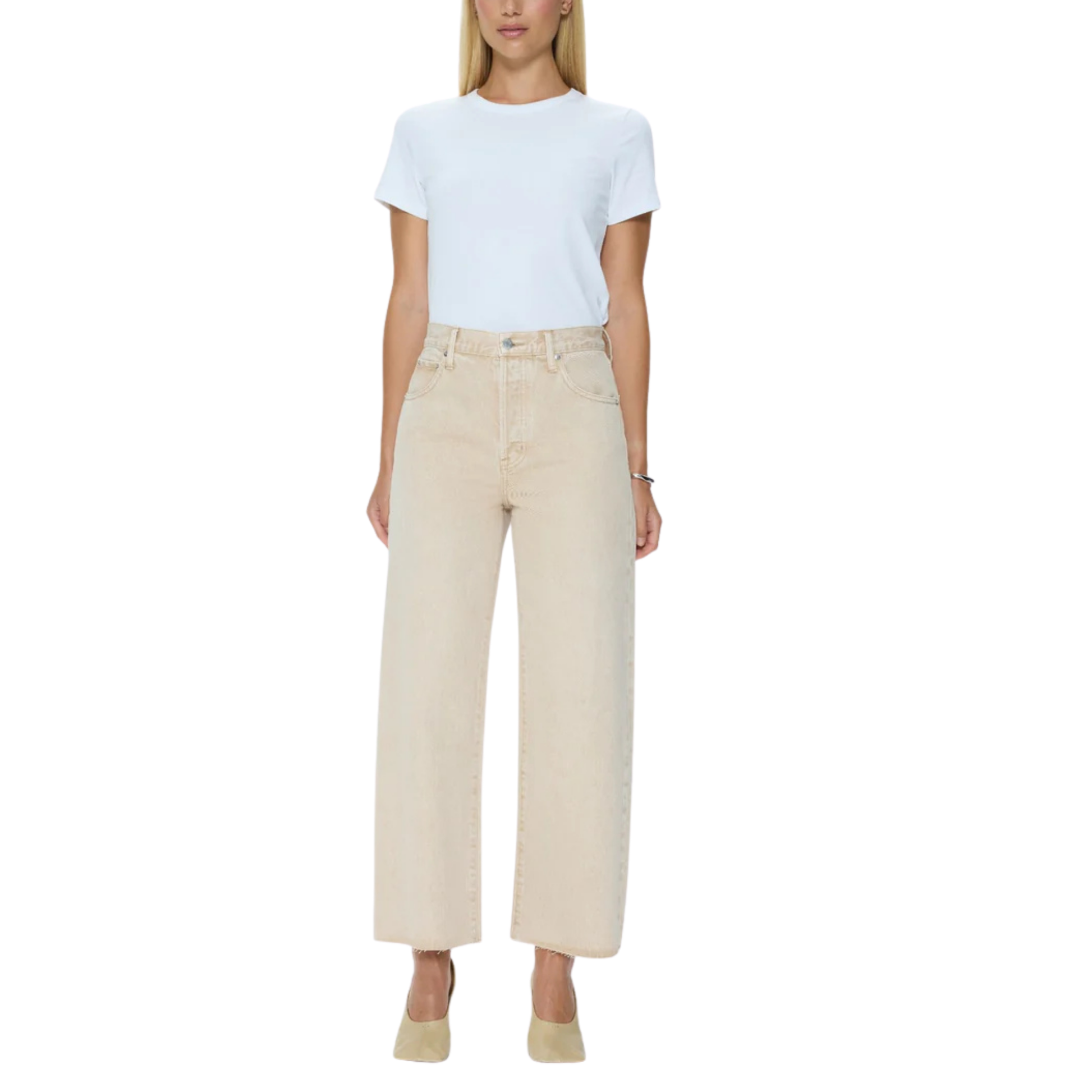 Designed with a high rise and dimensional bowed leg, Tate offers modern proportions with a clean, cropped length. Rigid 100% cotton denim creates a structured silhouette and contoured shape with a precise fit. Dune, a muted beige wash is the soft neutral that pairs seamlessly with any palette.