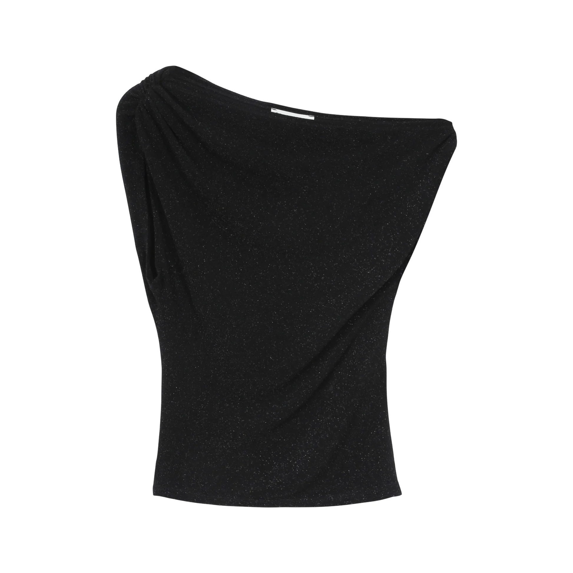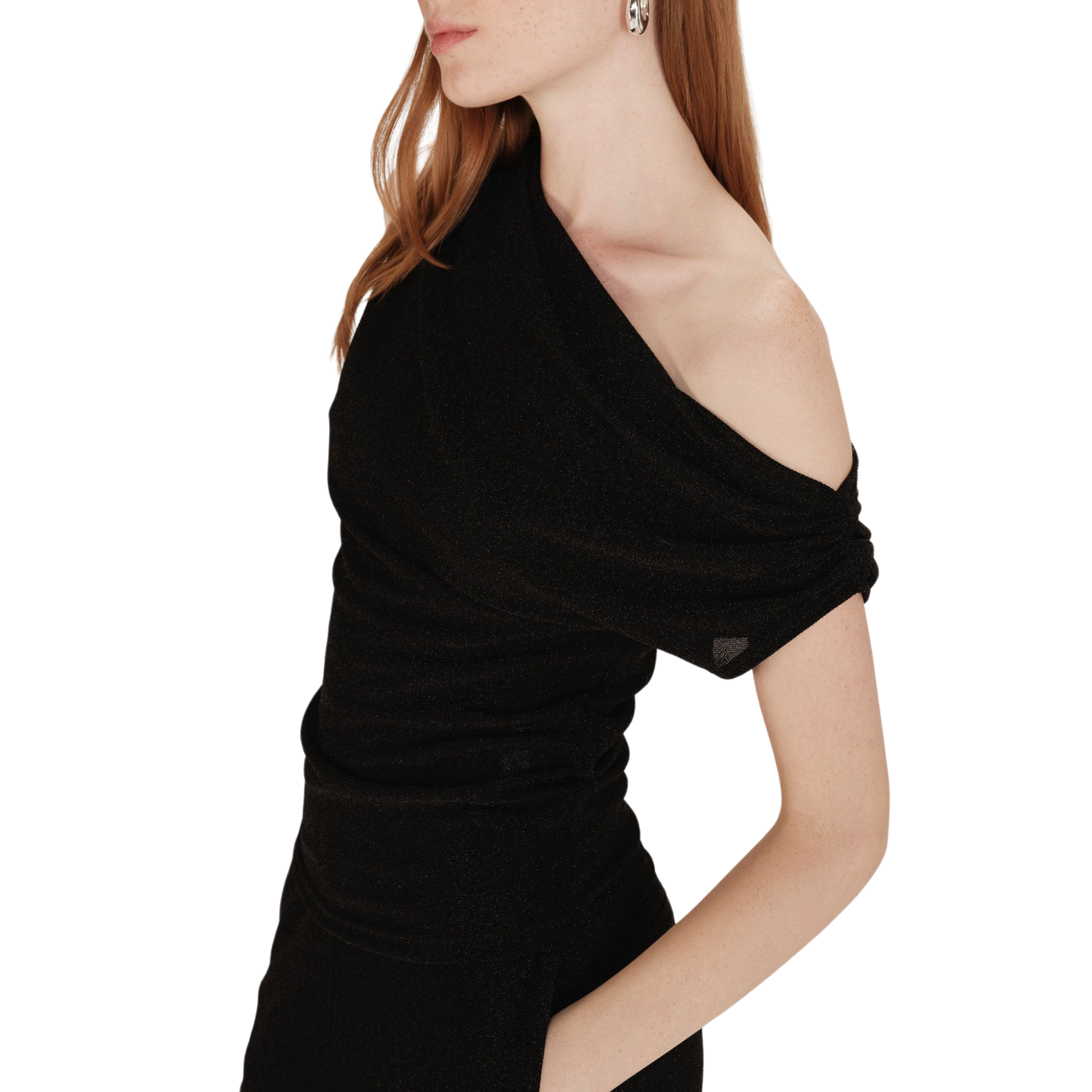 The THAO asymmetrical top is enhanced with lurex jersey fabric, offering a modern and feminine silhouette. Its asymmetrical, fitted cut is paired with gathered shoulders to create a draped effect that highlights the curves.
