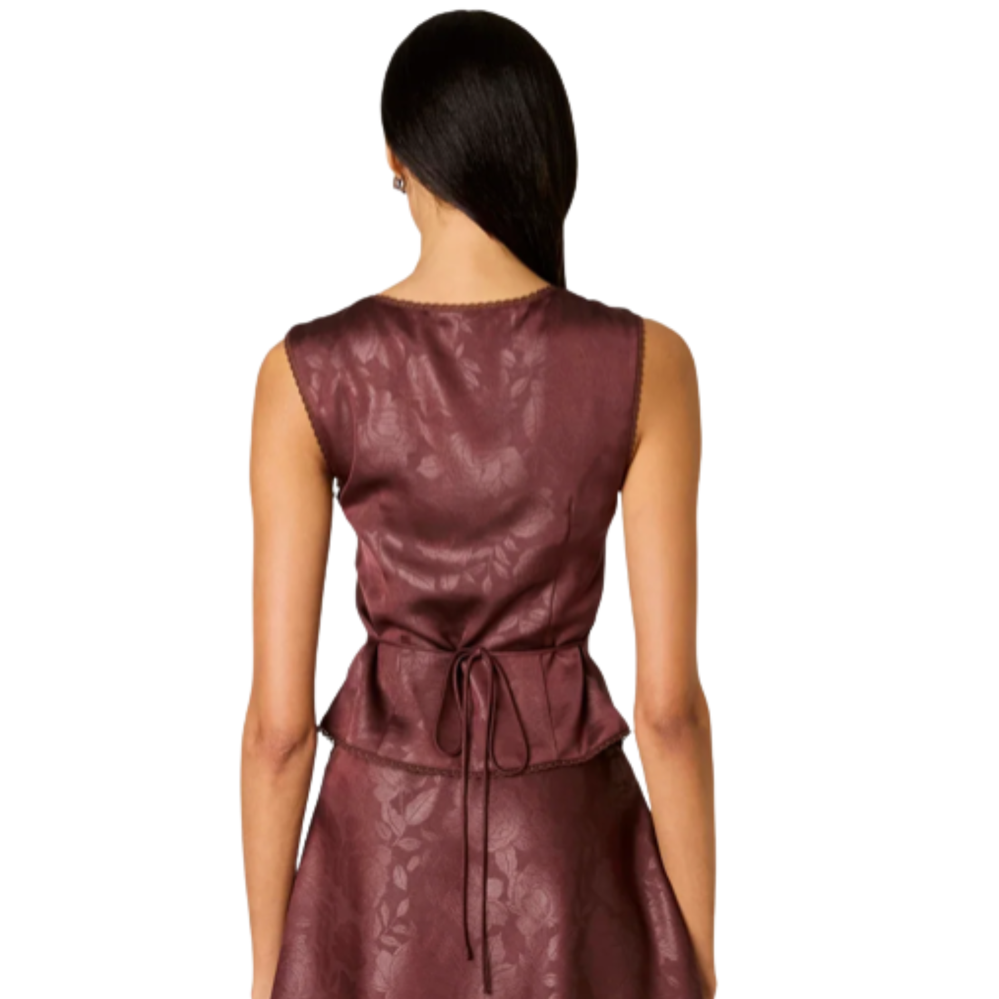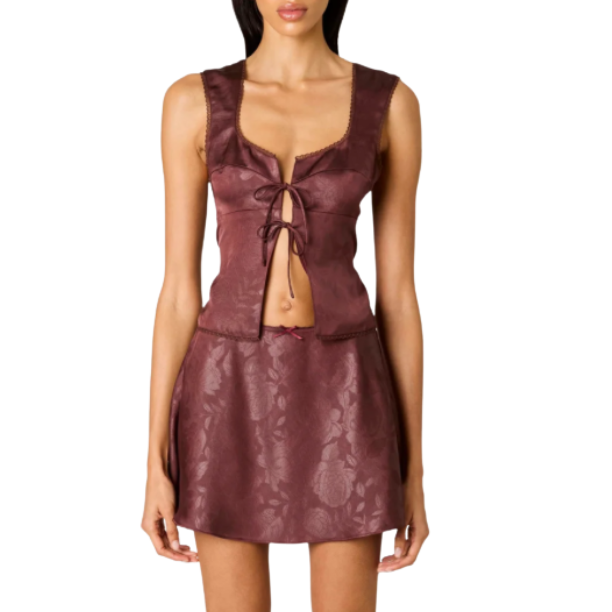 -Front tie closure at bust and adjustable self-tie at back waist for shaping