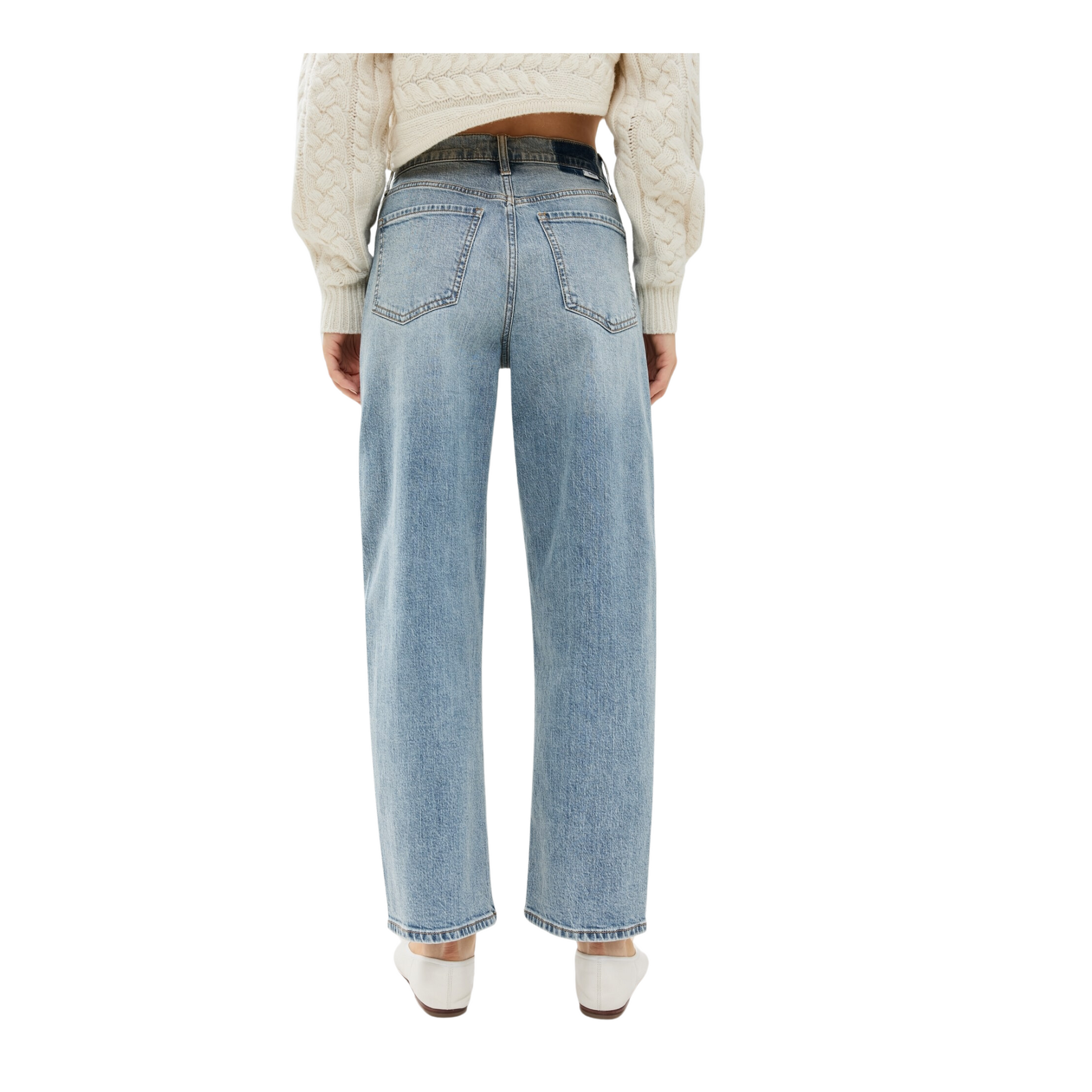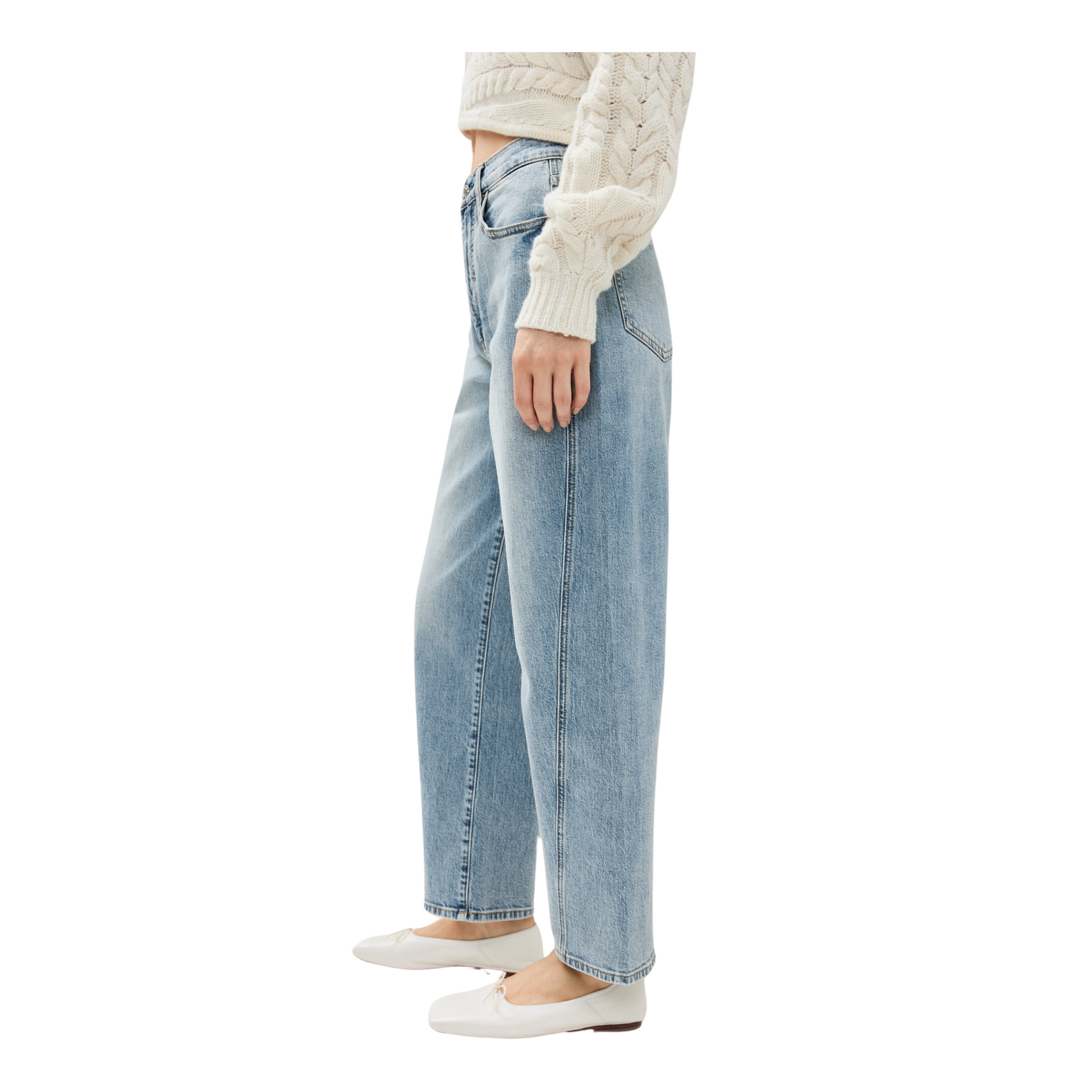 featuring a cinched waist, bowed leg, and slightly tapered ankle against a faded light wash, this jean is as versatile as it is flattering