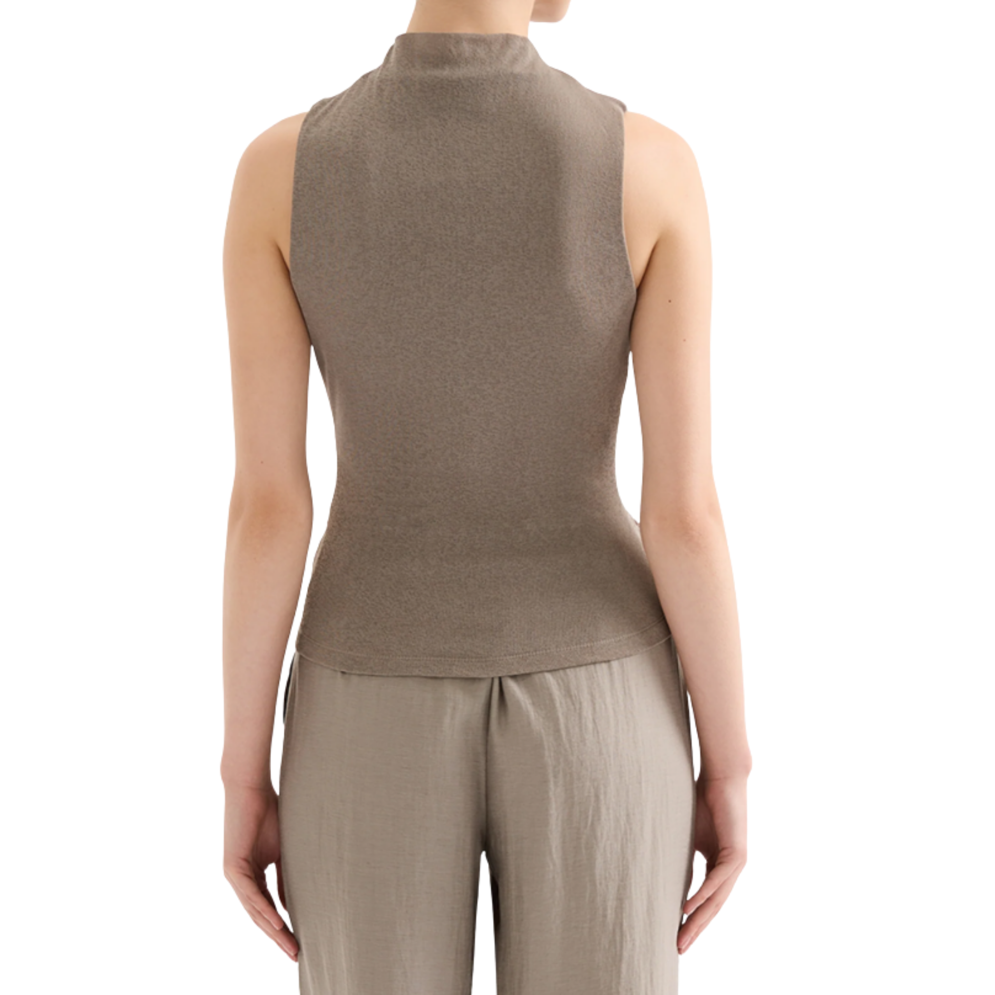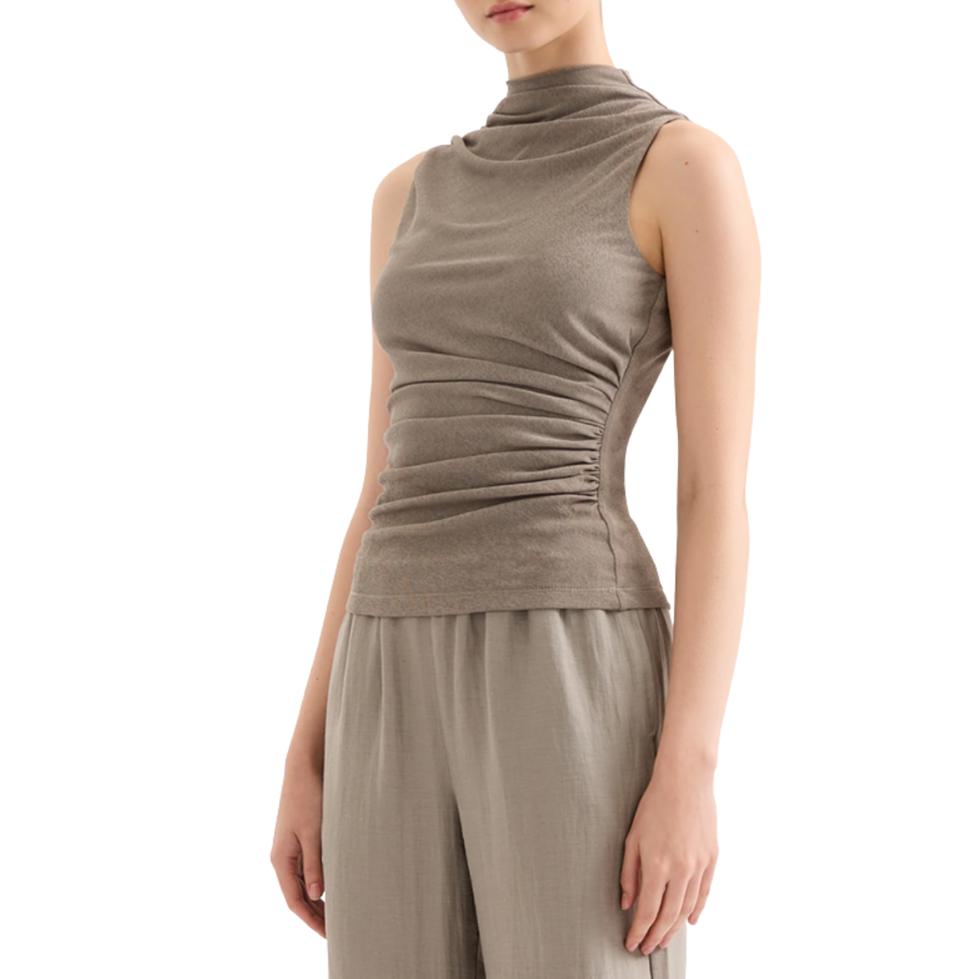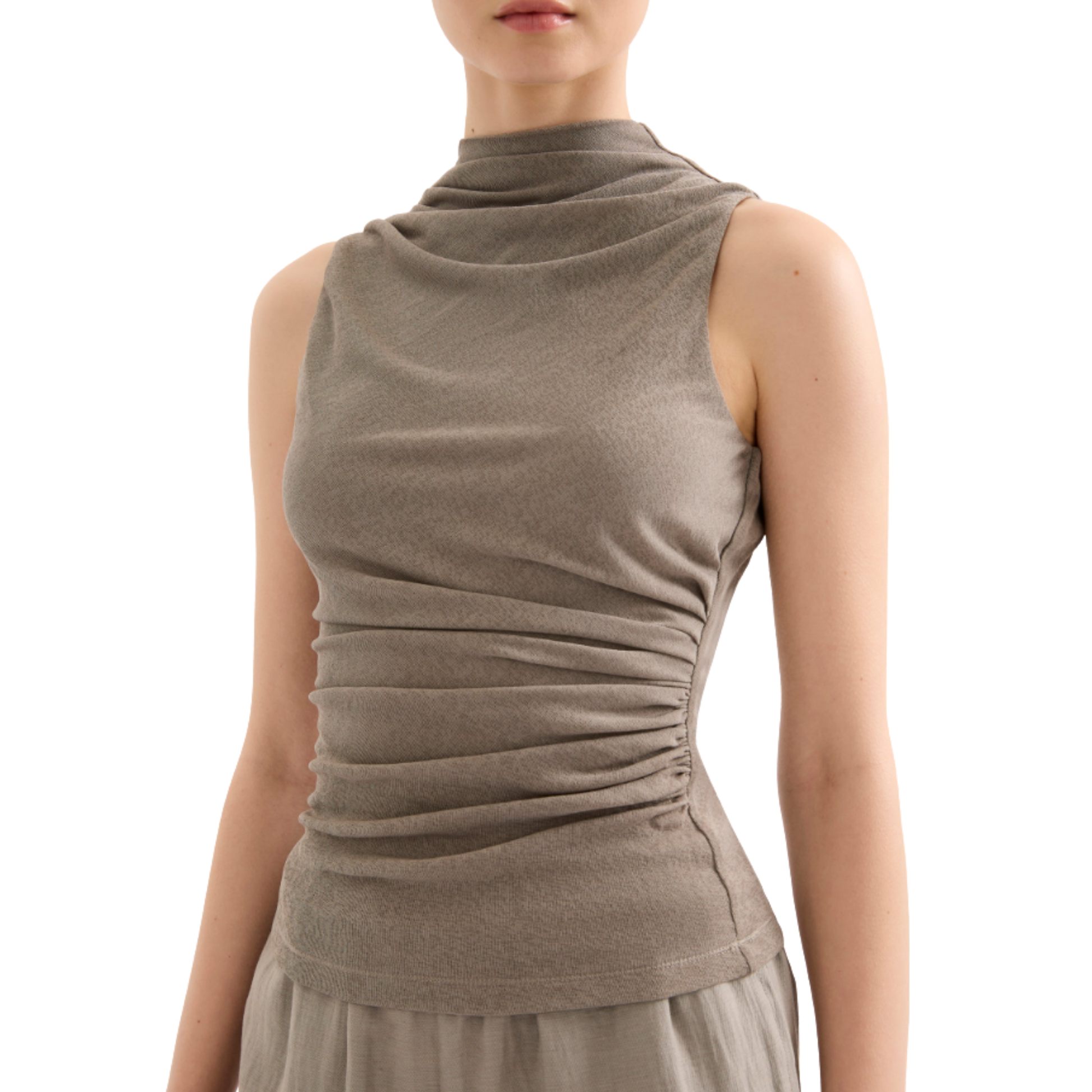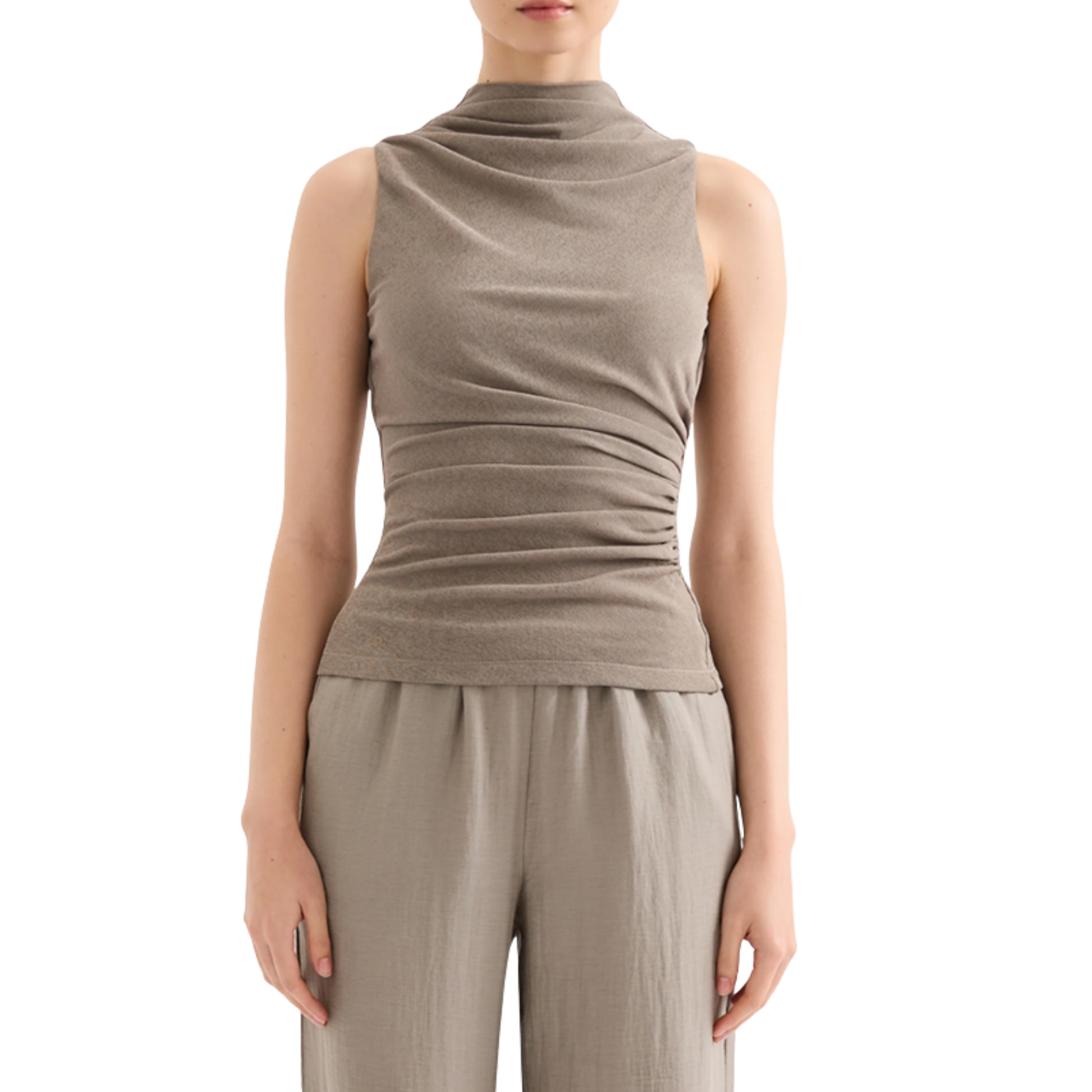 The Winnie Mesh Top is made from a stretch jersey with a dry hand feel. The silhouette is a form fitting tank with length finishing at the hip. Features include a raised neckline with soft gathering detail, and asymmetric draped gathering across the body. This top is fully lined.